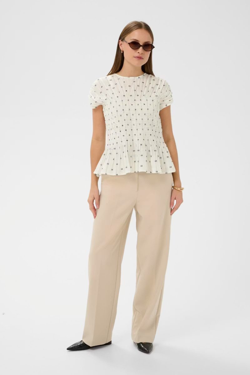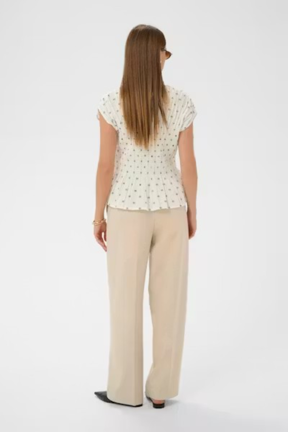 Blusa fruncida con acabado texturizado, cuello redondo y manga corta. Entallada en el corpiño con un sutil peplum. Delicado detalle de lunares en toda la prenda.