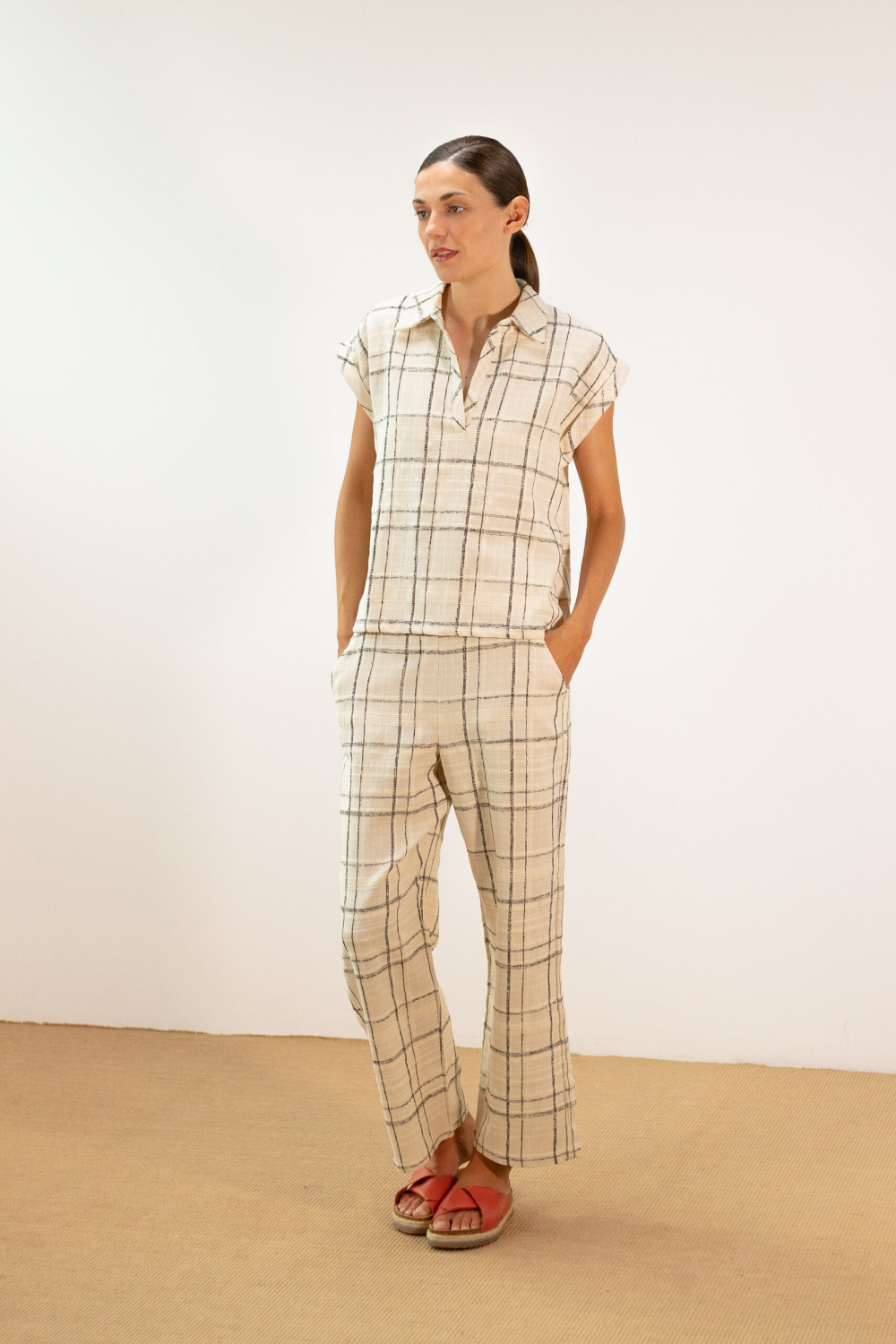 Blusa de cuadros con cuello polo. La tela es de cuadros en color verde sobre fondo crudo. El patrón es recto, con cuello tipo polo sin botones, escote en pico y manga corta de hombro caído. Ideal para un total look con el pantalón de pinzas a conjunto o para llevar con vaqueros y sandalias