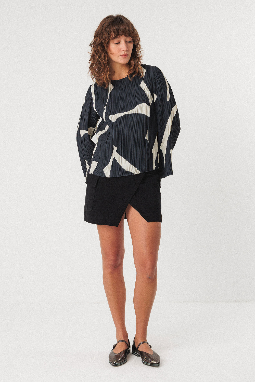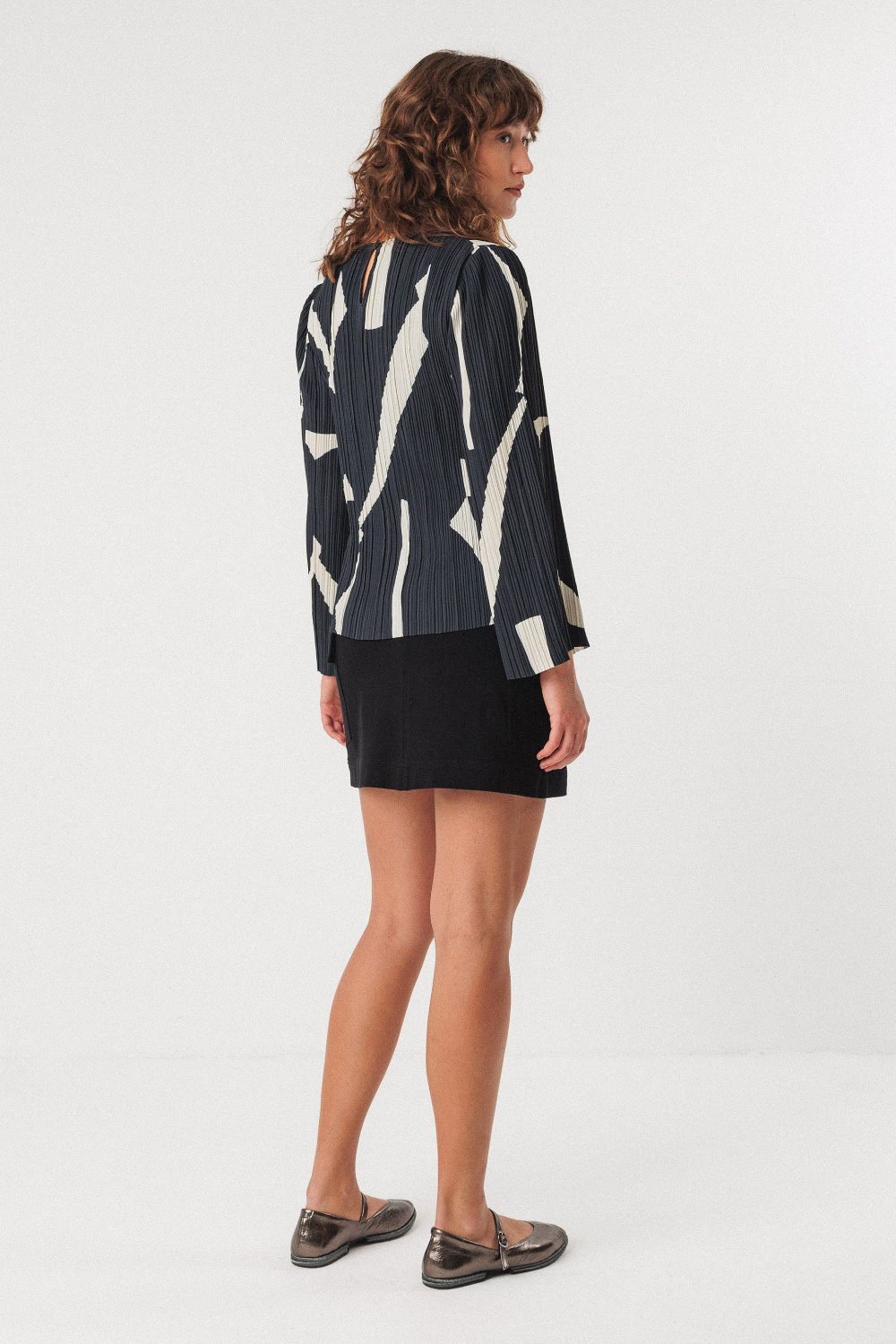Camisa plisada de corte recto, cuello redondo y manga larga acampanada, adornada con una abertura en la espalda.