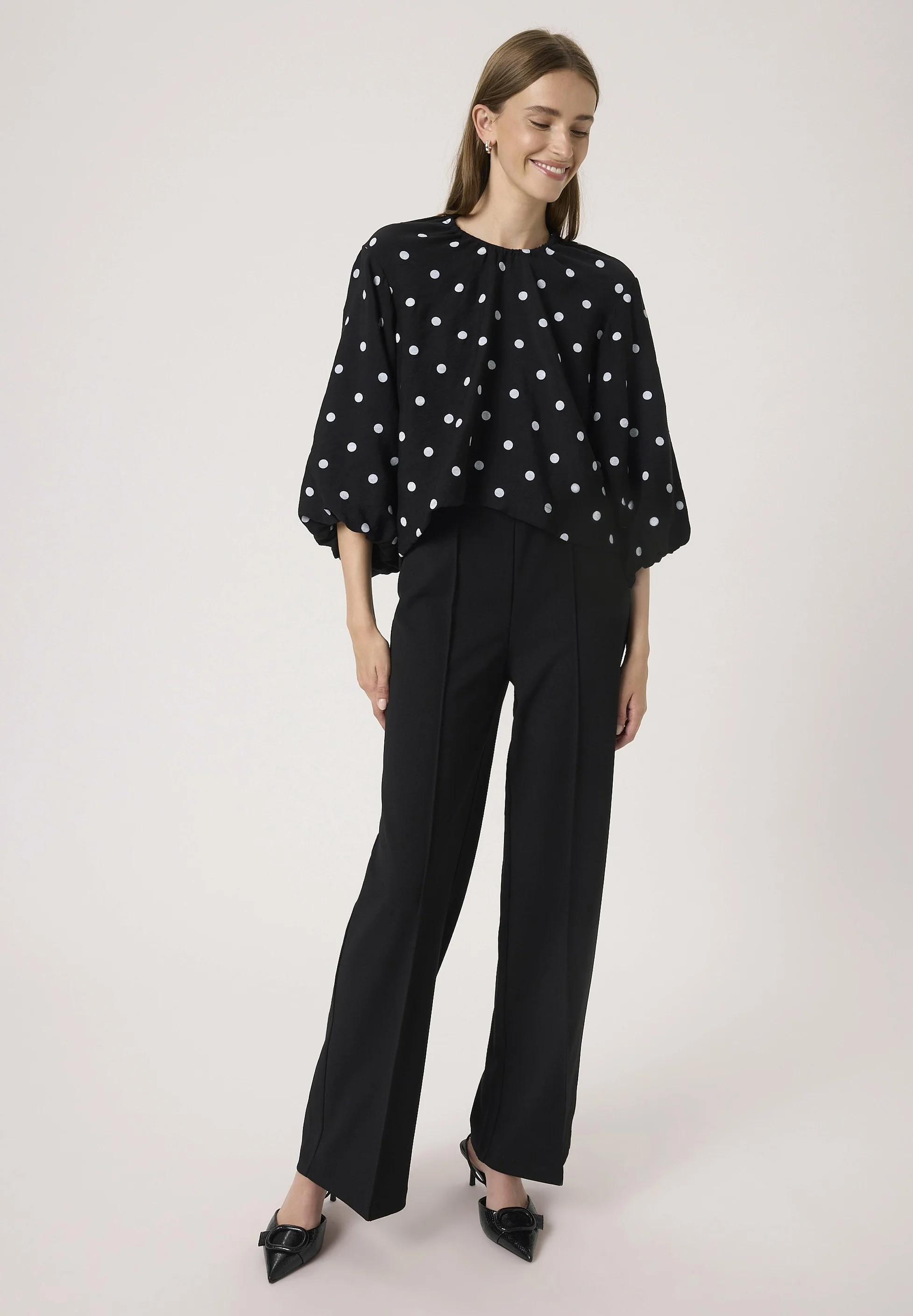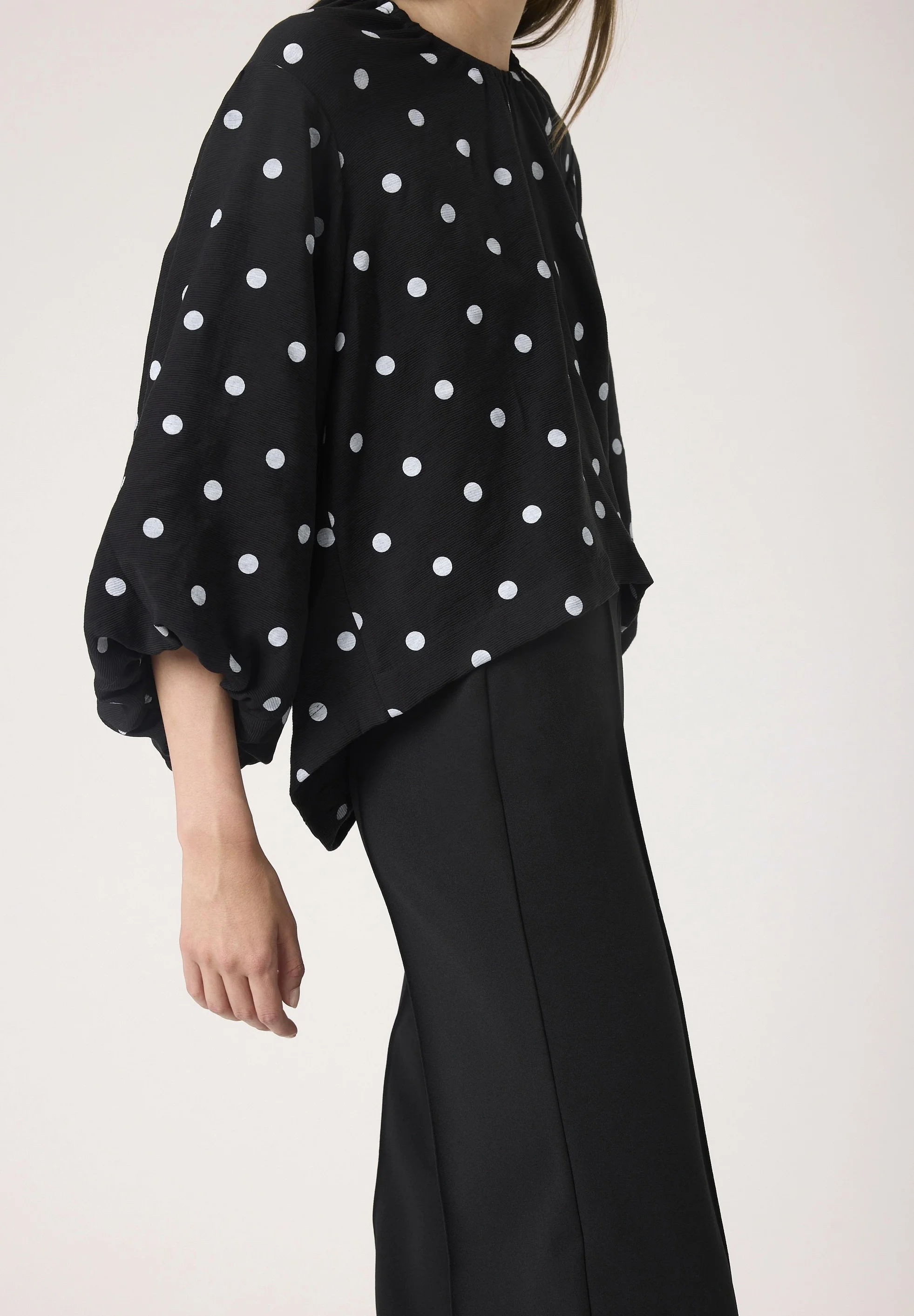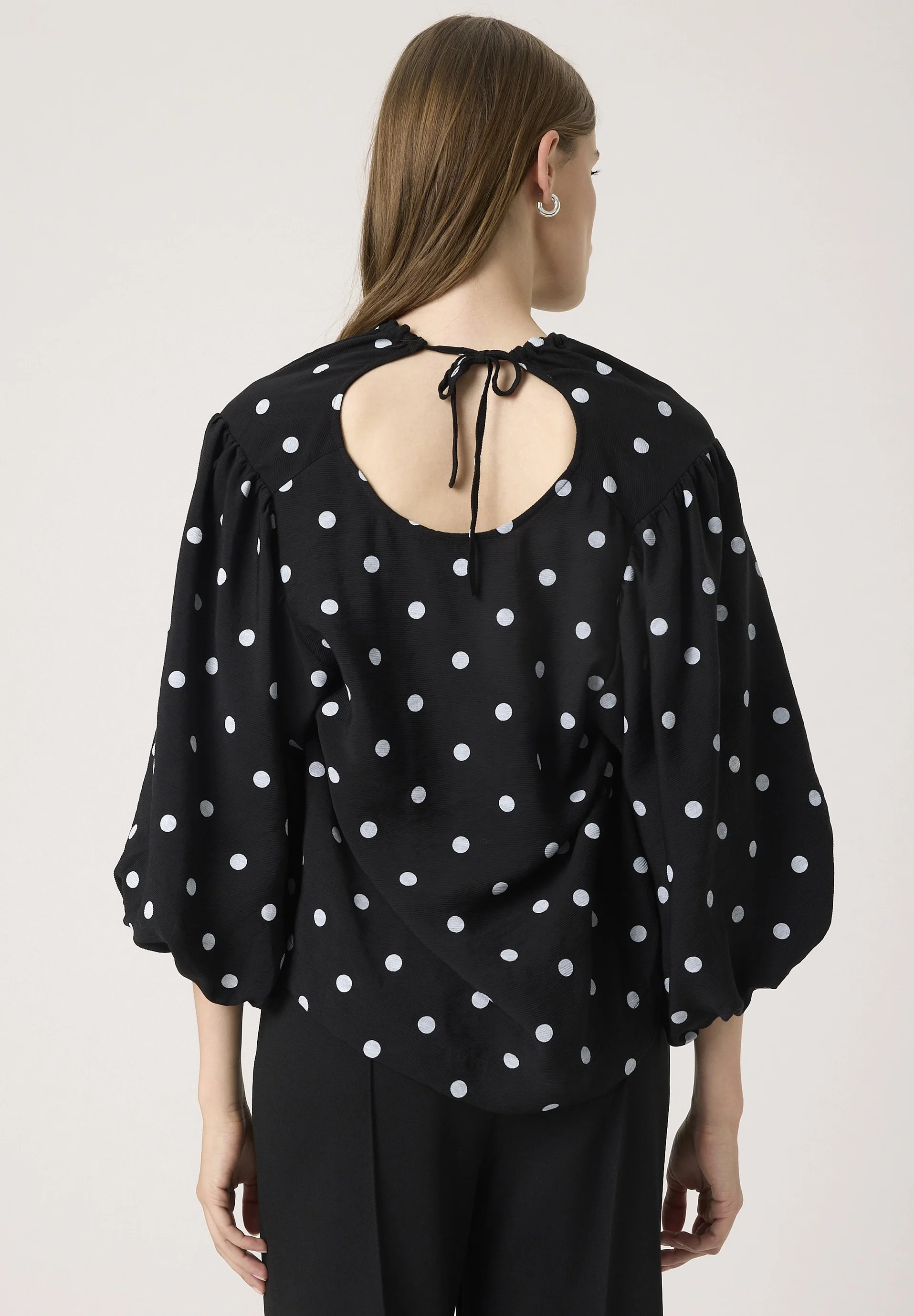 Blusa de la firma danesa SOAKED con un diseño moderno y femenino. Confeccionada en un tejido ligero de caída fluida, presenta un estampado de lunares en contraste que aporta un toque clásico y atemporal. Su silueta amplia y las mangas abullonadas realzan la comodidad y el movimiento natural de la prenda.