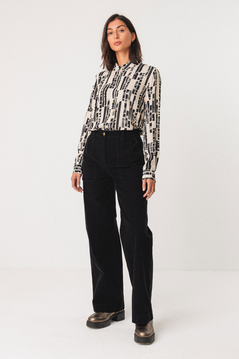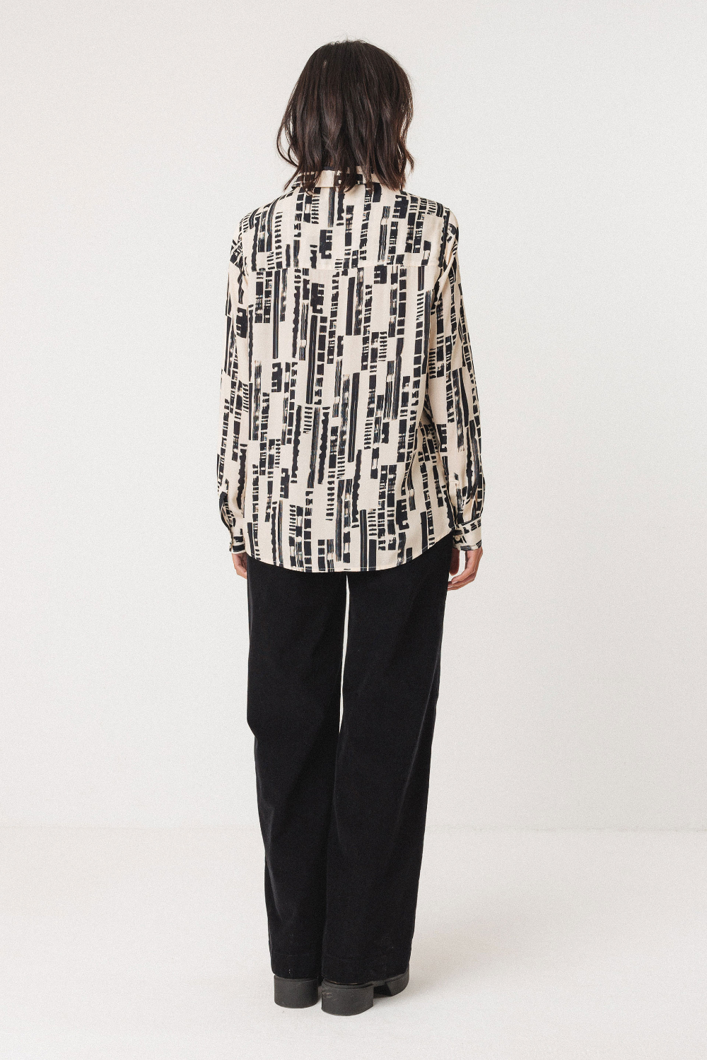 Camisa estampada de corte recto con cuello camisero, mangas largas y puños con botones, de look único con cierre delantero fácil de abotonar.