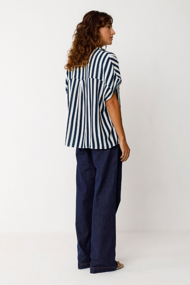 Camisa amplia sin mangas, de hombros caídos, con un cierre delantero abotonado con efecto plisado.
