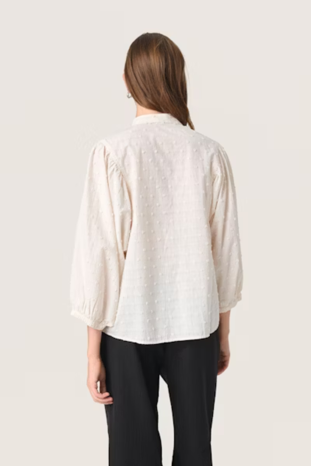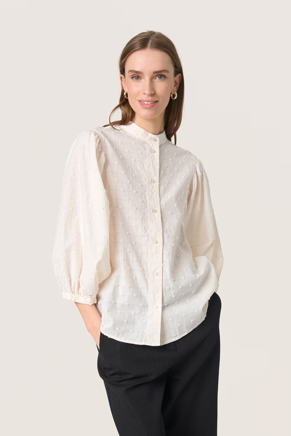 Blusa de la firma SOAKED en un suave tono crema con textura tejida. Diseñado con mangas globo y un delicado frente abotonado, este estilo ofrece una silueta relajada y detalles refinados.