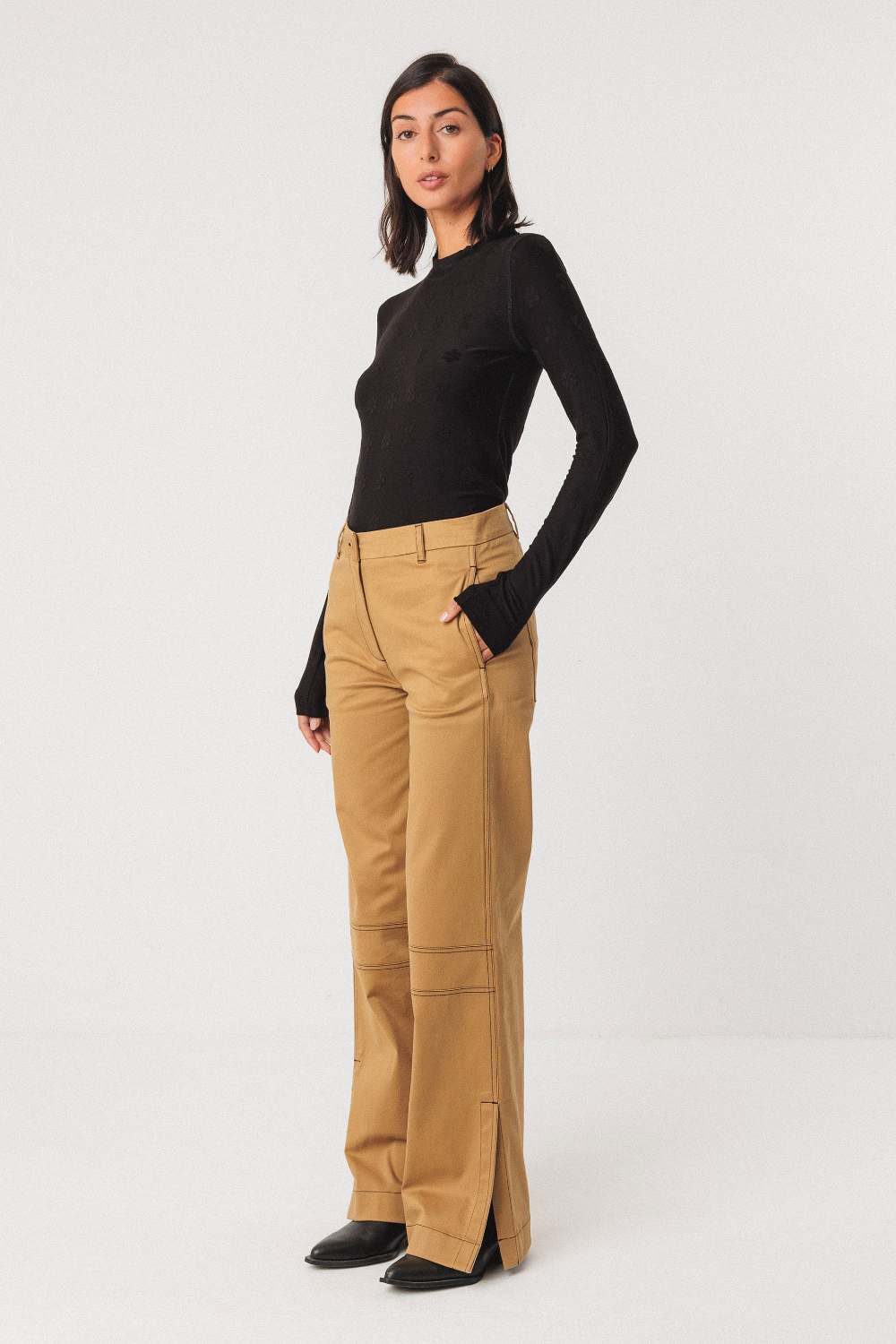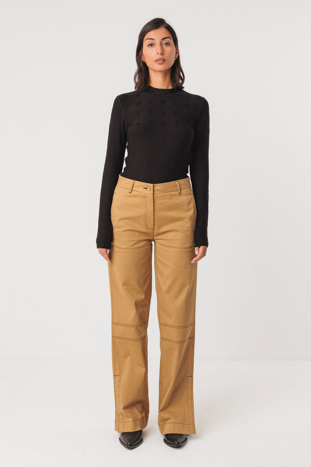 Camiseta ceñida de manga larga con cuello alto, adornada con costuras remalladas de adorno. En foto combinada con pantalón HESTIA.