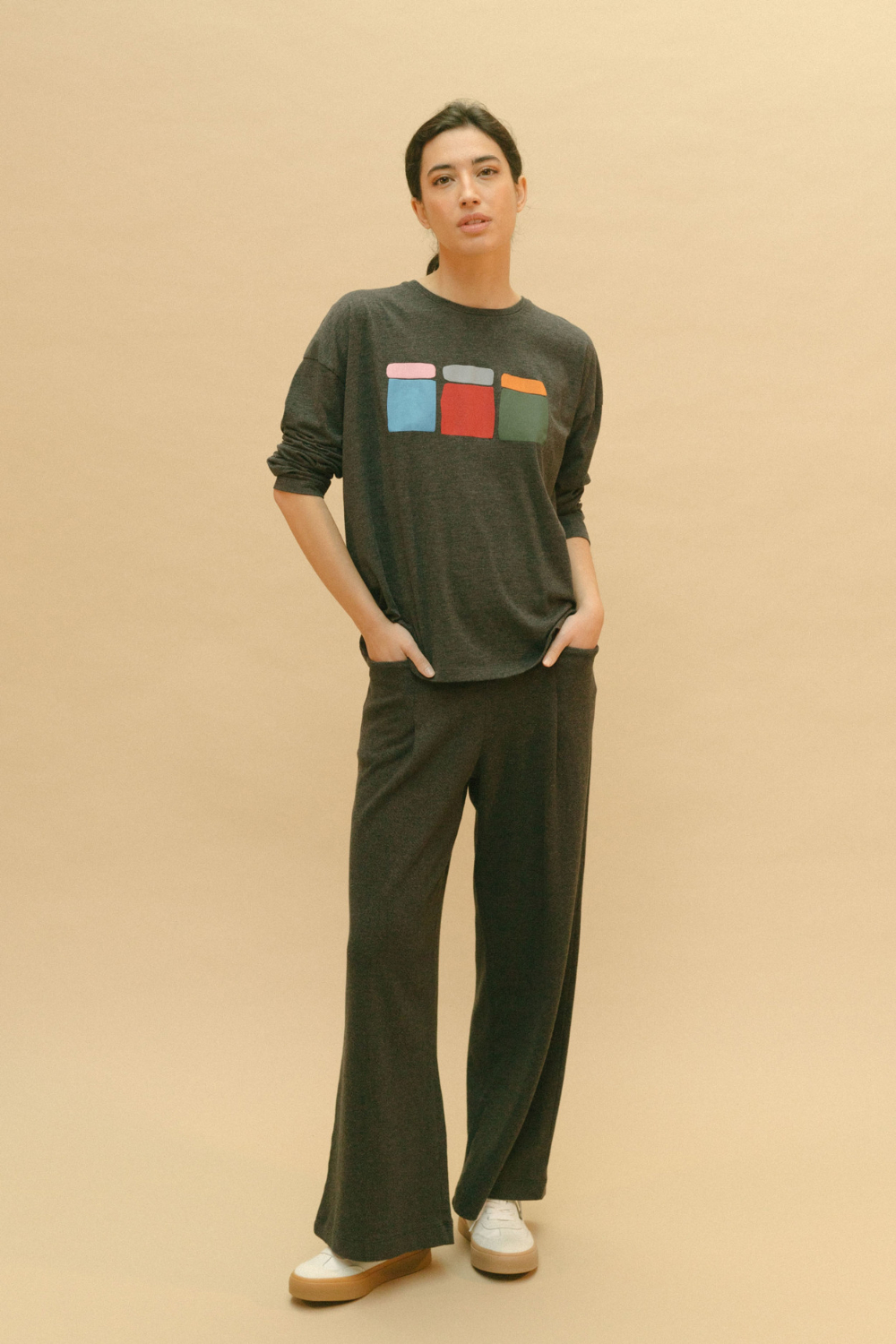 Camiseta en gris marengo con diseño de tarros para guardar las esencias que nos despiertan los sentidos. Ilustración original de PAN