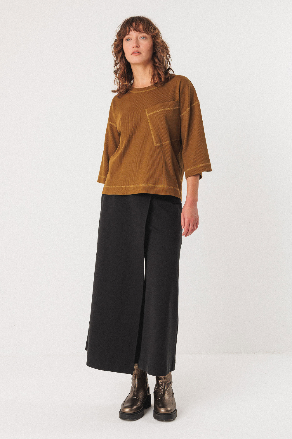 Camiseta amplia de cuello redondo adornada con un bolsillo en el pecho y costuras remalladas de adorno. Las mangas llegan por debajo del codo y tiene gramaje algo grueso.