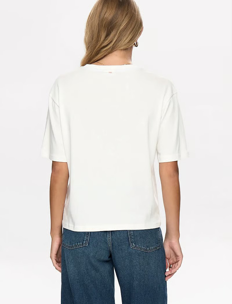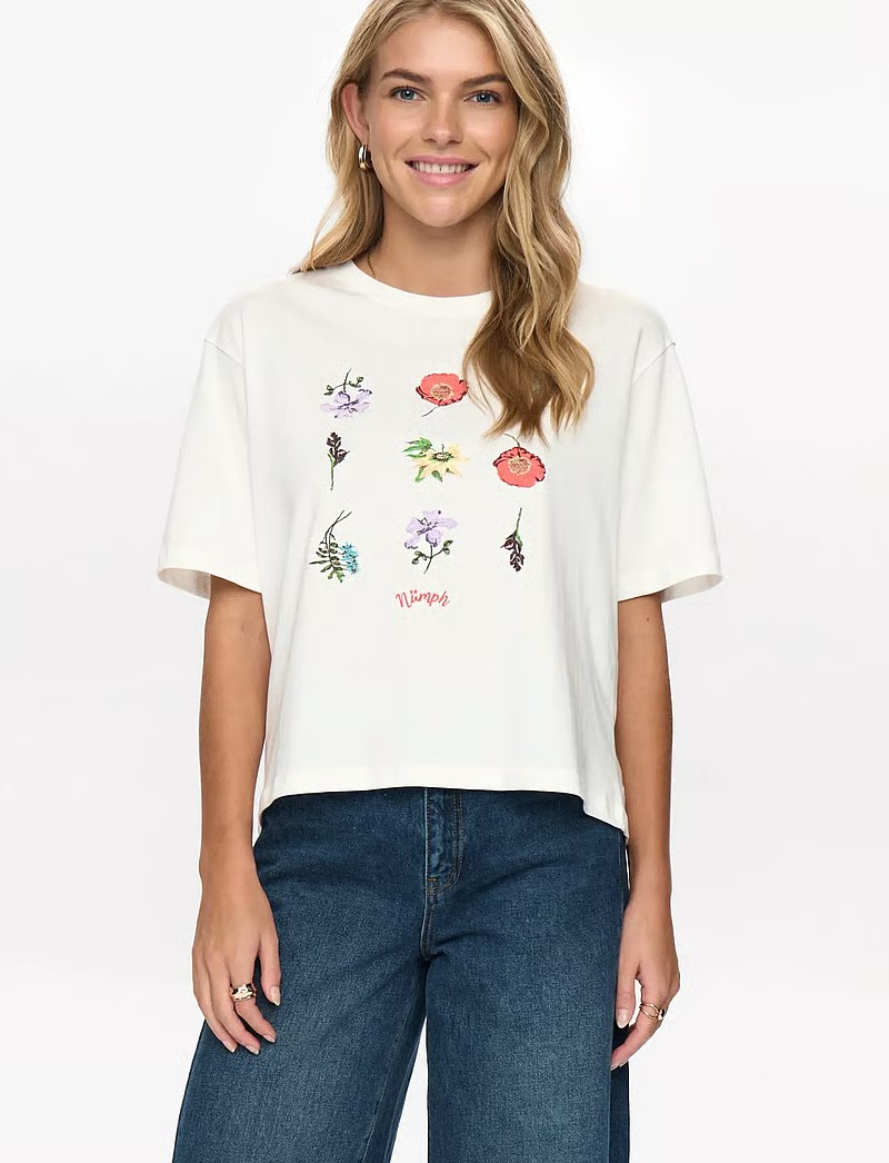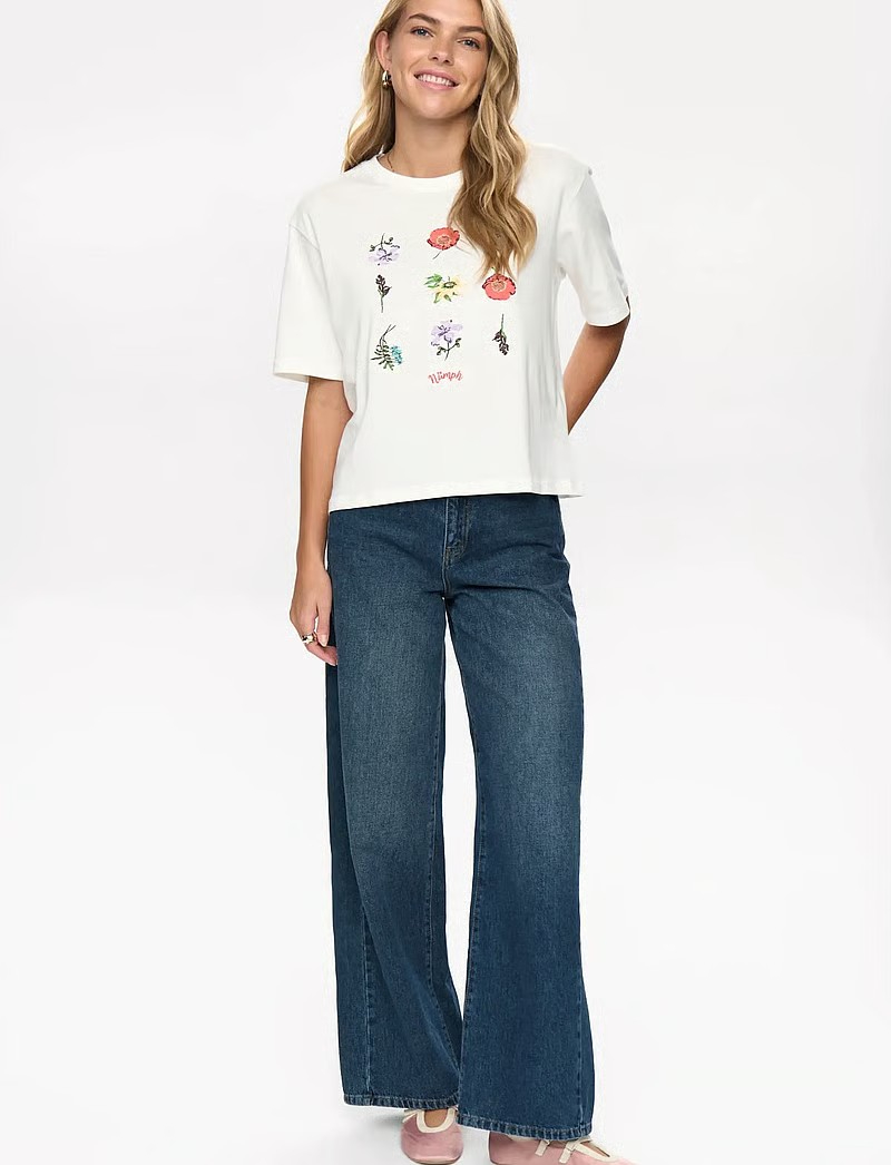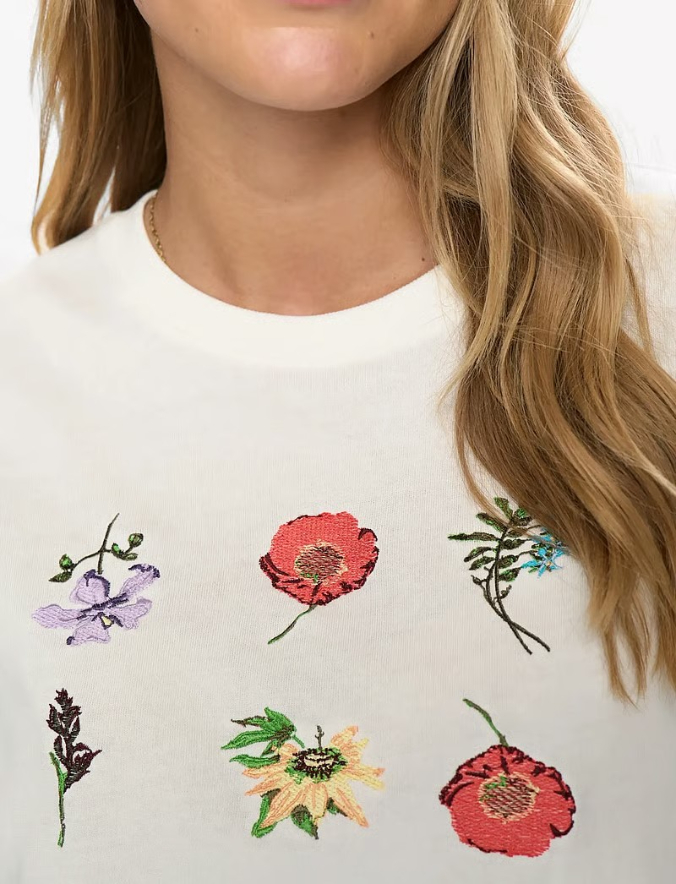 Camiseta de manga corta con detalles florales que aportan un toque natural a esta camiseta cuadrada. Su corte holgado y sus mangas cortas la convierten en una opción cómoda para el día a día.
