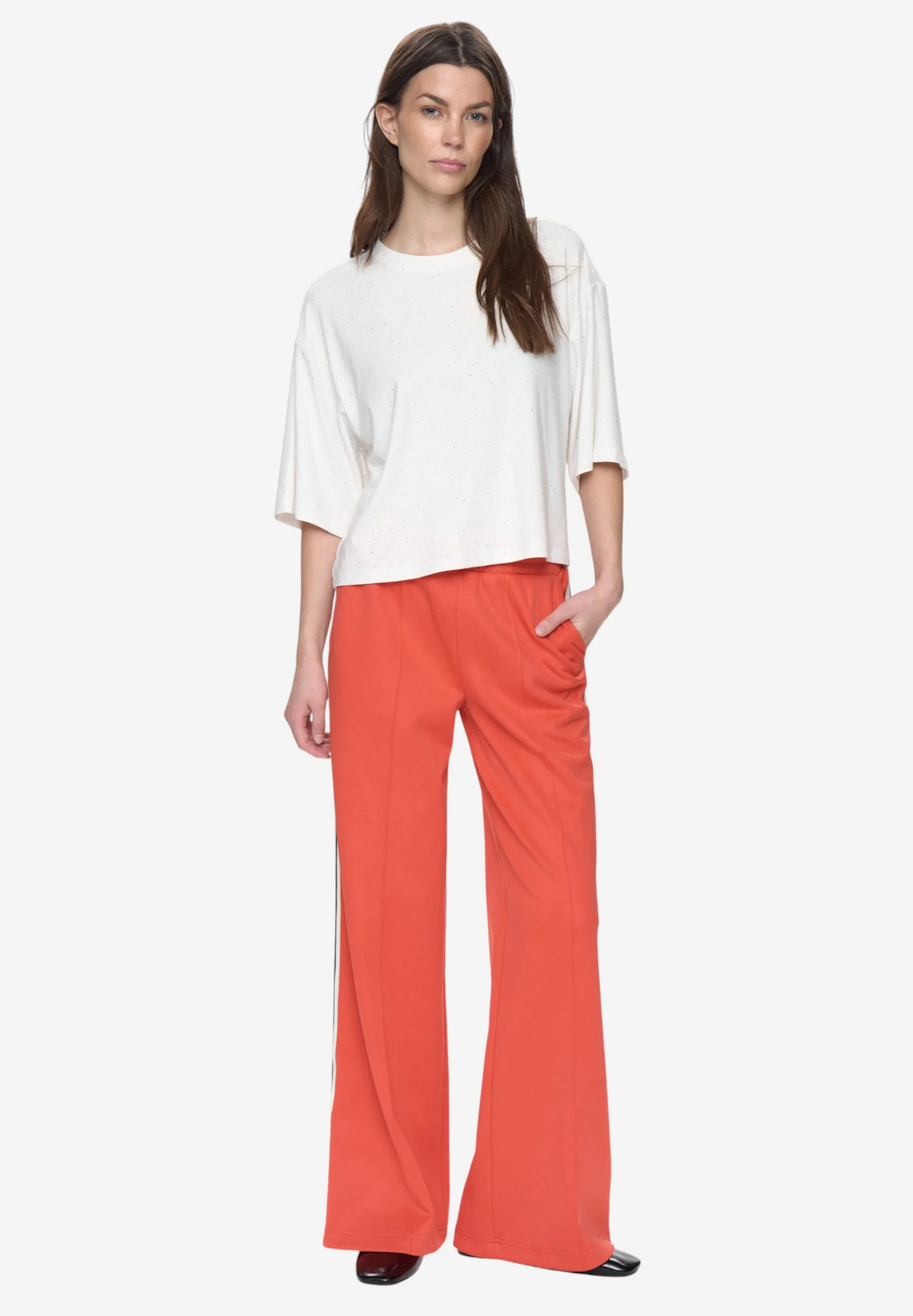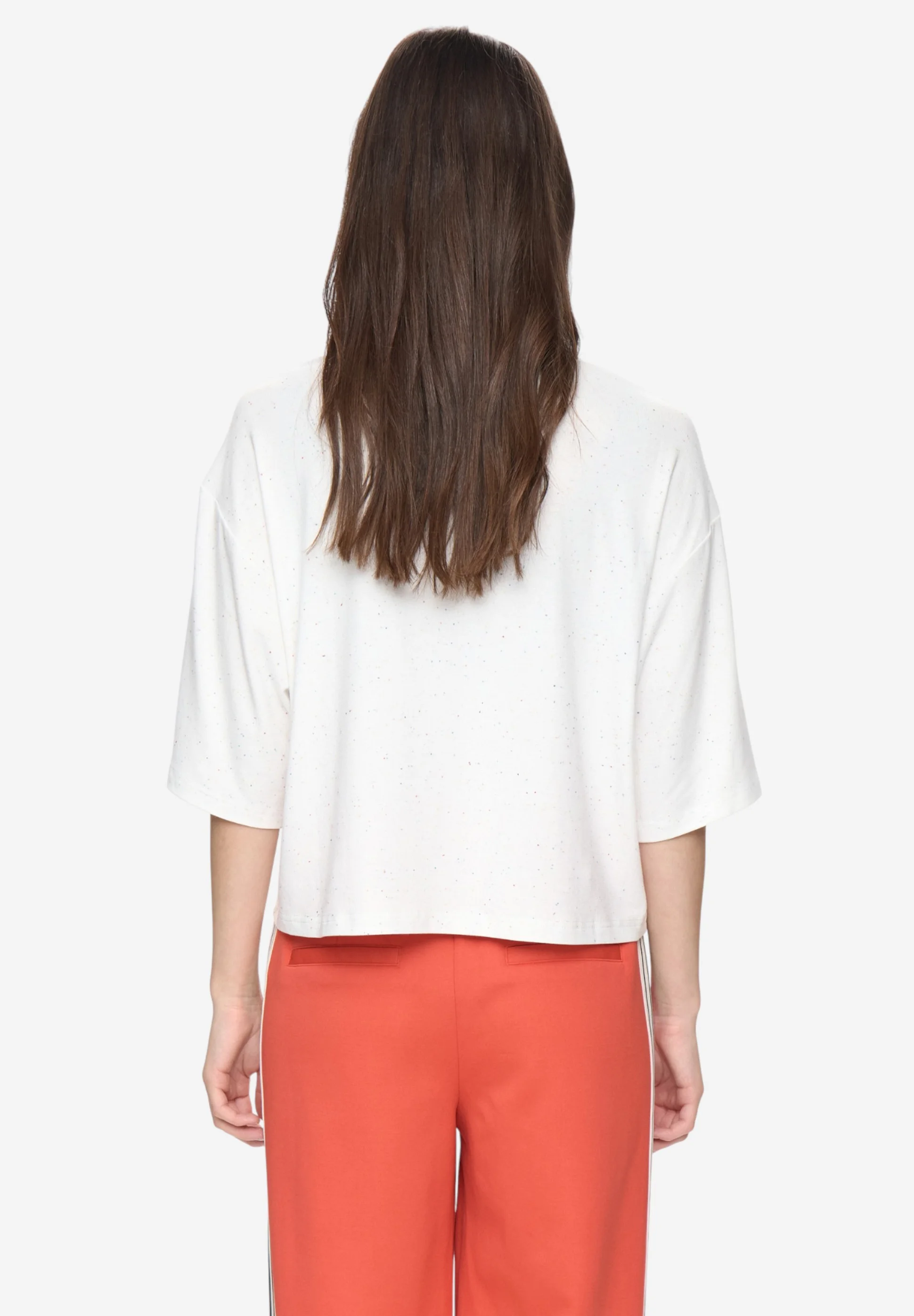 Camiseta de la firma danesa NUMPH con estampado jaspeado de tejido blanco. Presente una manga corta holgada y un cuello redondo.