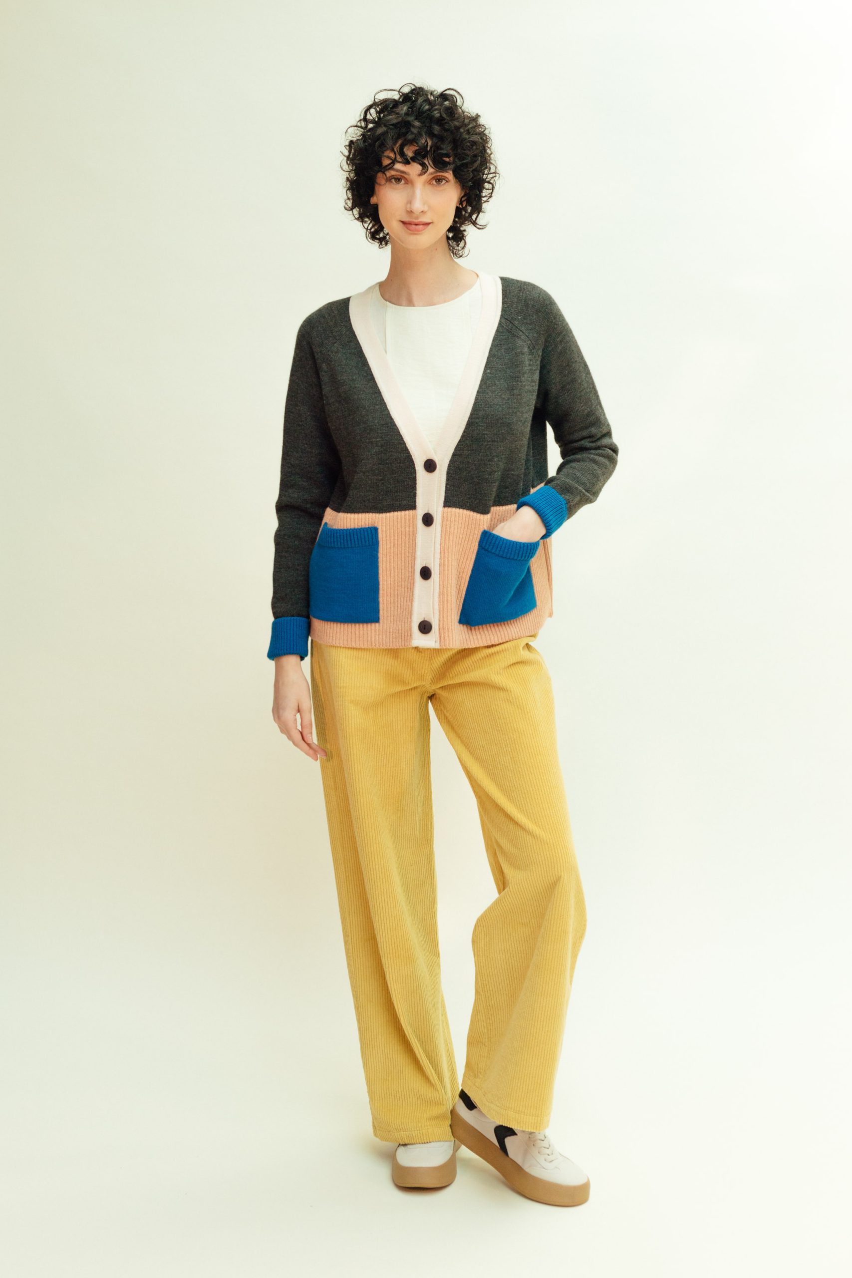 Cárdigan en tejido de punto combinado en tonos gris oscuro, beige y azul. Escote en “V” con ribete claro y cierre frontal con botones grandes. Manga larga con puños acanalados en contraste azul. Bolsillos frontales de parche en punto grueso, también en azul. Parte inferior en tono durazno con textura acanalada. Corte recto y relajado, ideal para un look moderno y confortable.