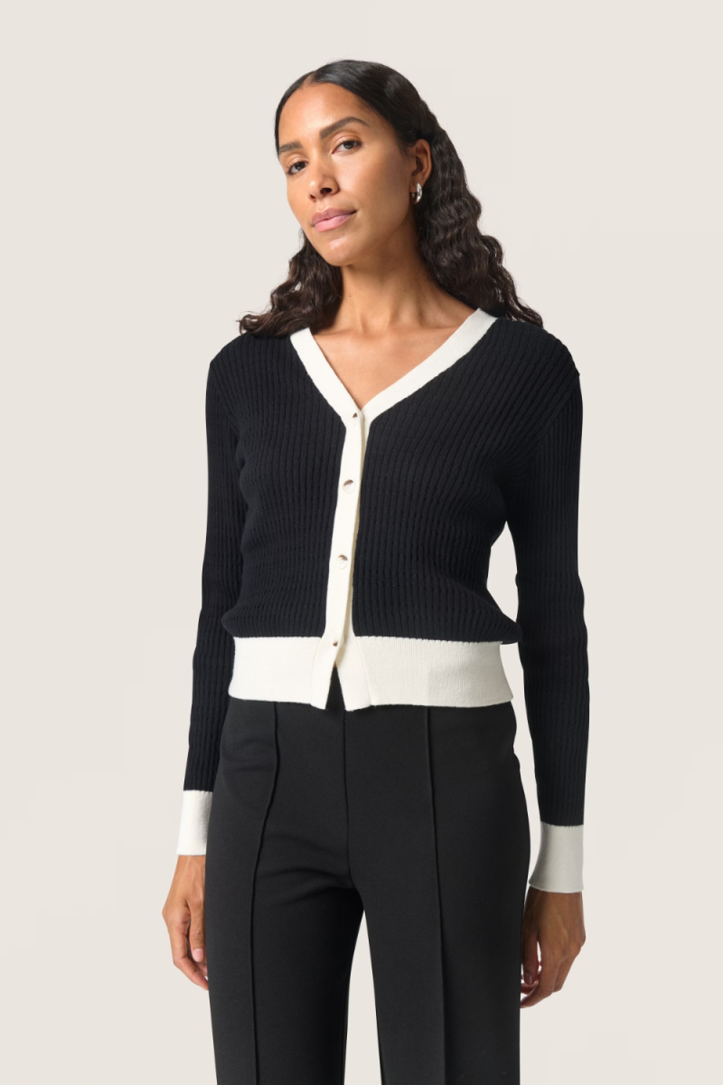 Cárdigan de la firma danesa SOAKED en color negro con detalle en contraste en color blanco.