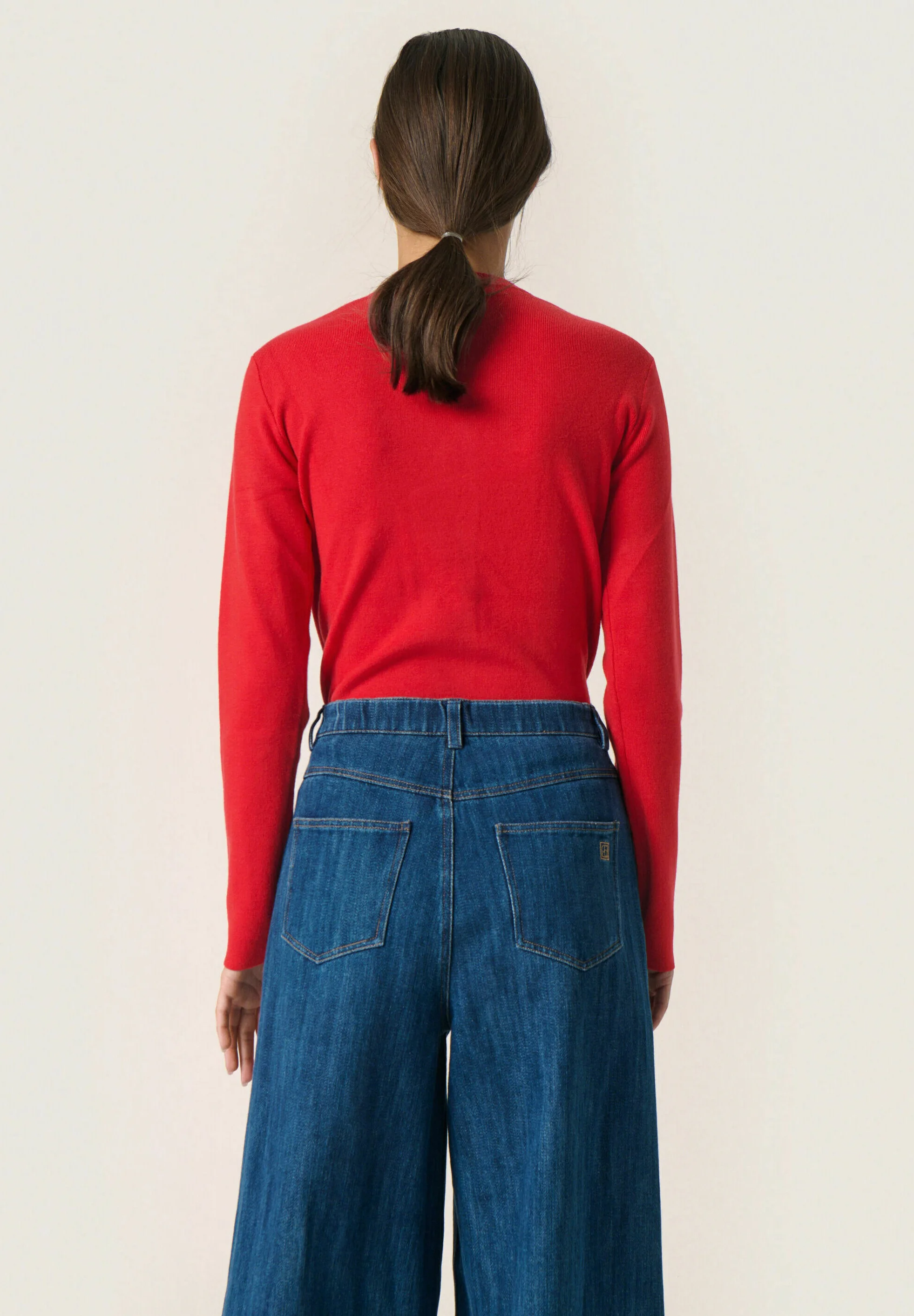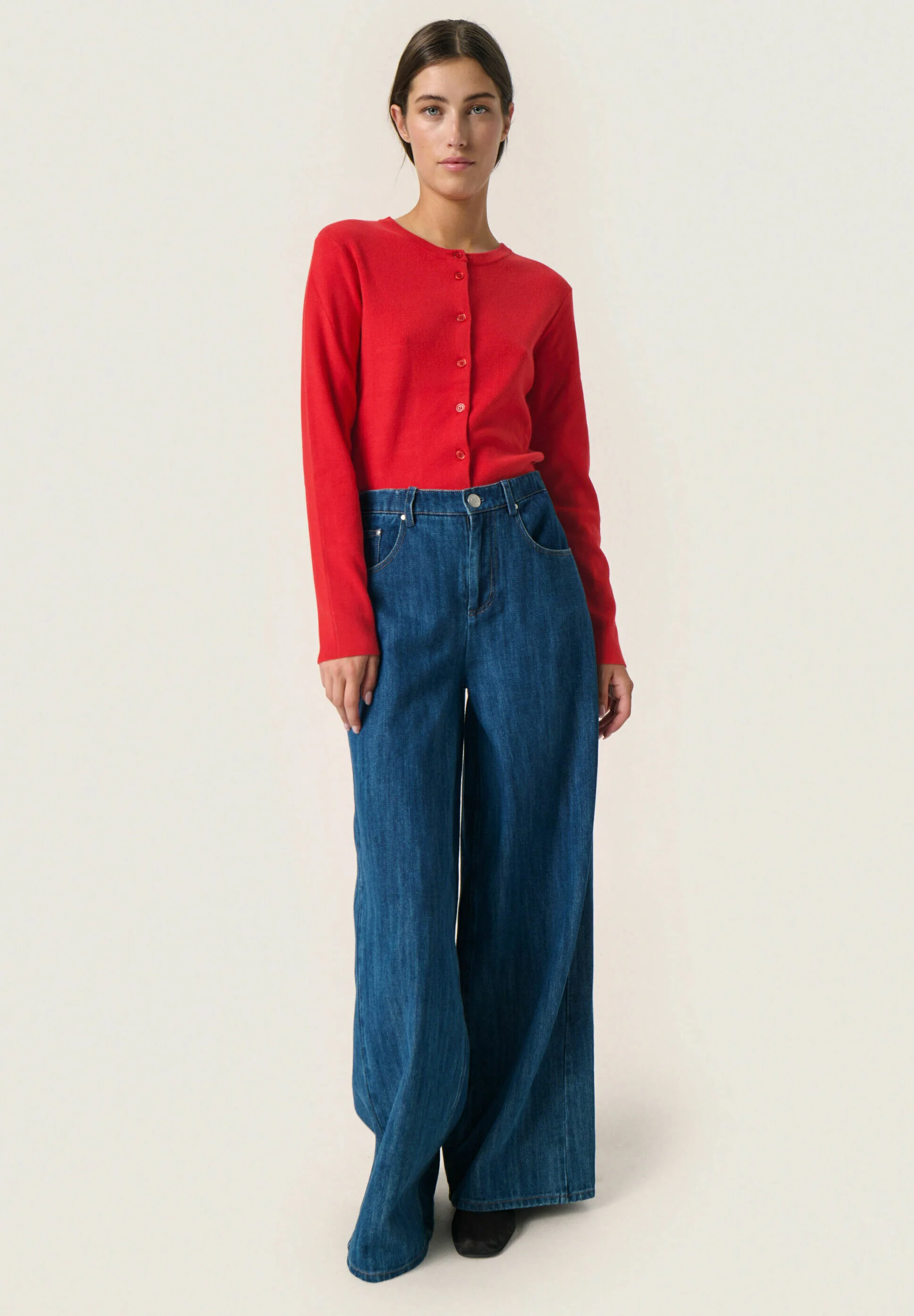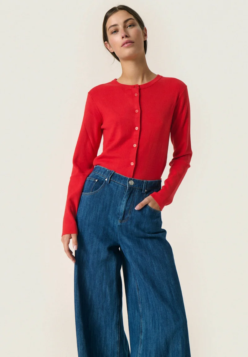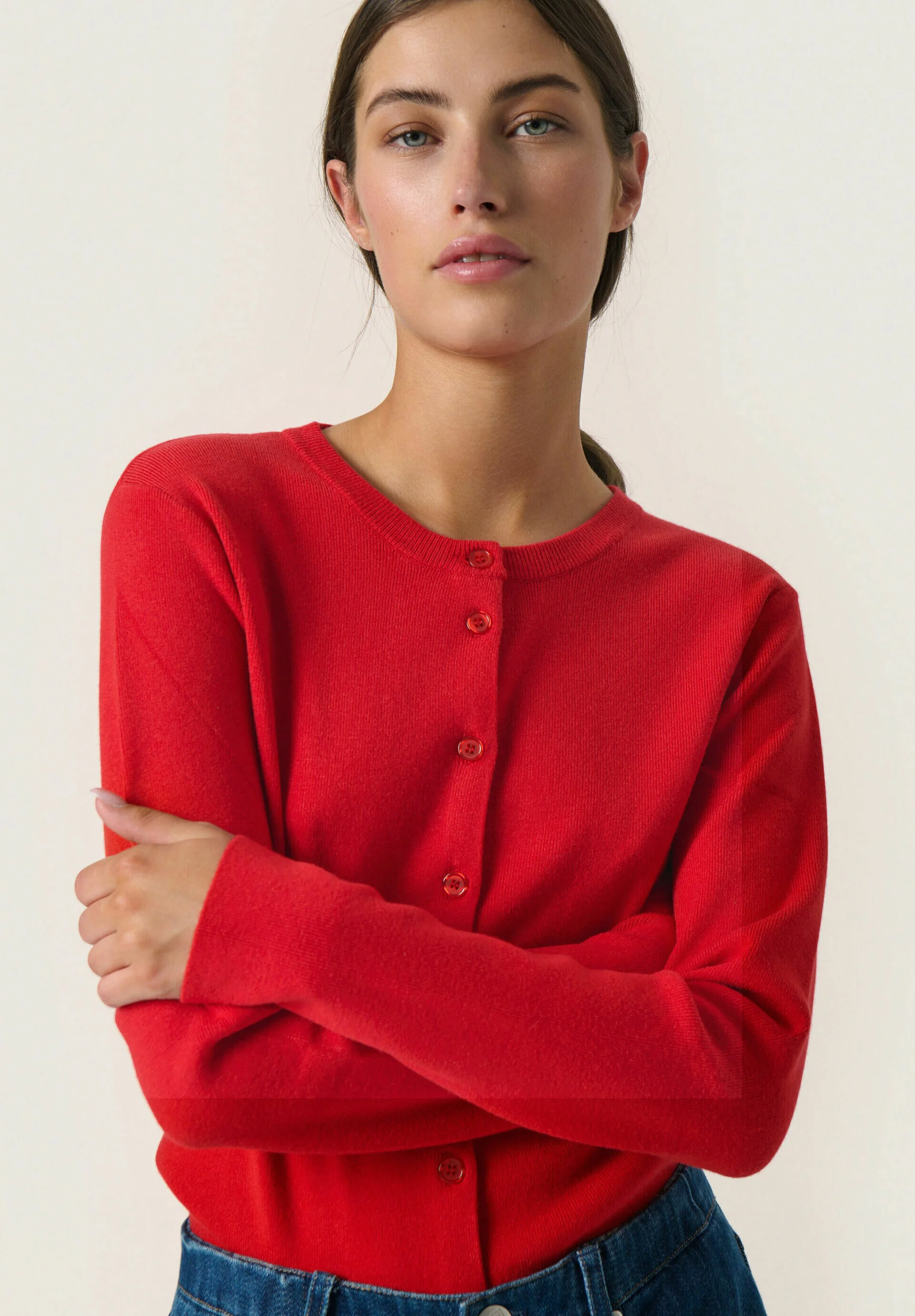 Cárdigan de la firma danesa SOAKED con un diseño clásico y depurado. Confeccionado en un tejido suave y ligero, ofrece un tacto agradable y una caída natural que aporta comodidad durante todo el día. Presenta cuello redondo, cierre frontal con botones al tono y un corte entallado que realza la silueta sin perder elegancia.