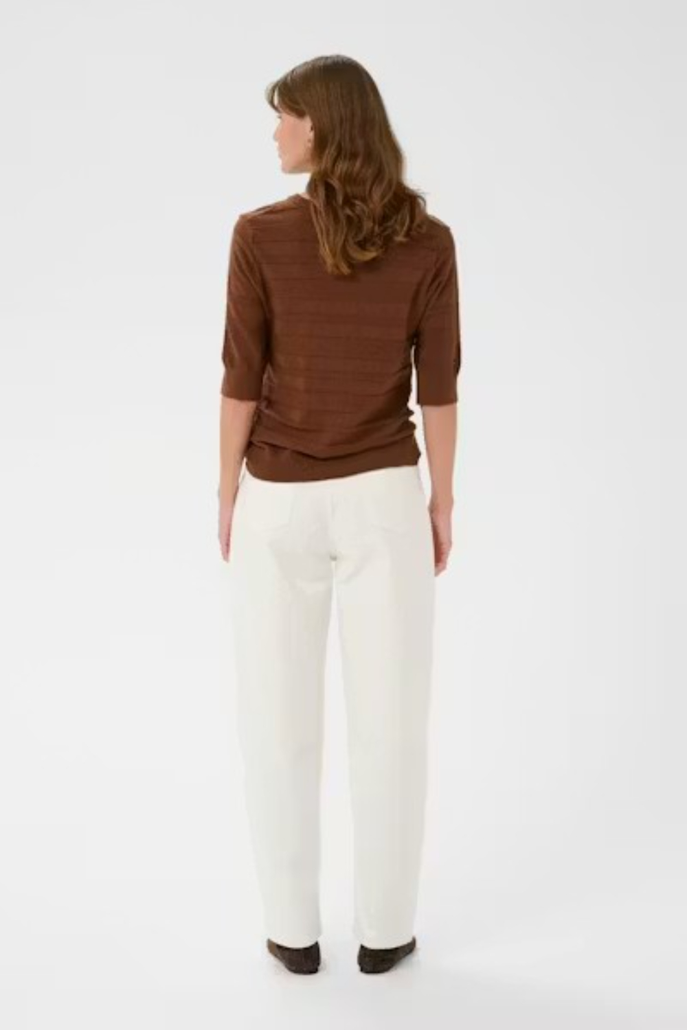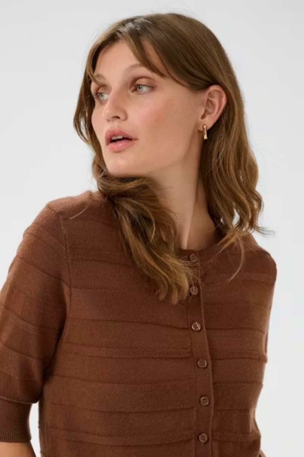 Cárdigan abotonado de corte recto, cuello redondo clásico y mangas hasta el codo. Sutiles rayas horizontales texturizadas le aportan dimensión, y una tapeta de botones lisa le da un toque atemporal y relajado.