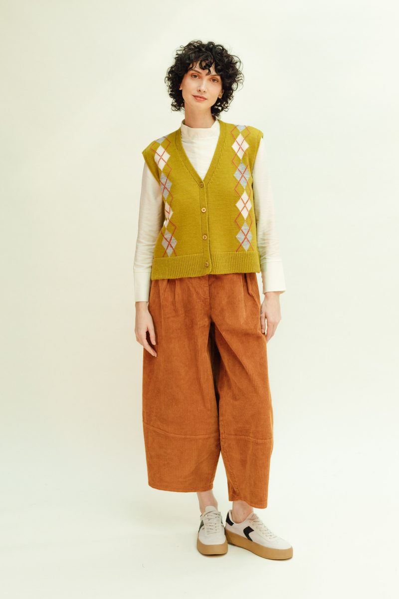 Chaleco de punto con diseño de rombos en tonos verde oliva, blanco, celeste y teja. Escote en pico y cierre delantero con dos botones. Sin mangas y con terminaciones acanaladas en el bajo. Corte recto y tejido de textura suave para un estilo retro y acogedor.