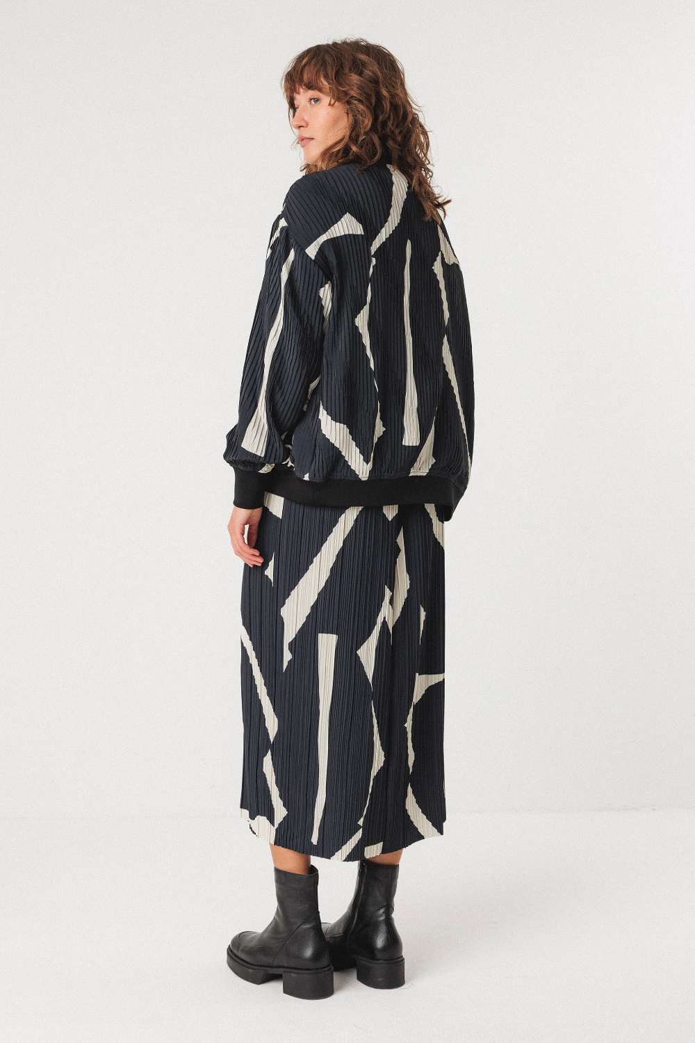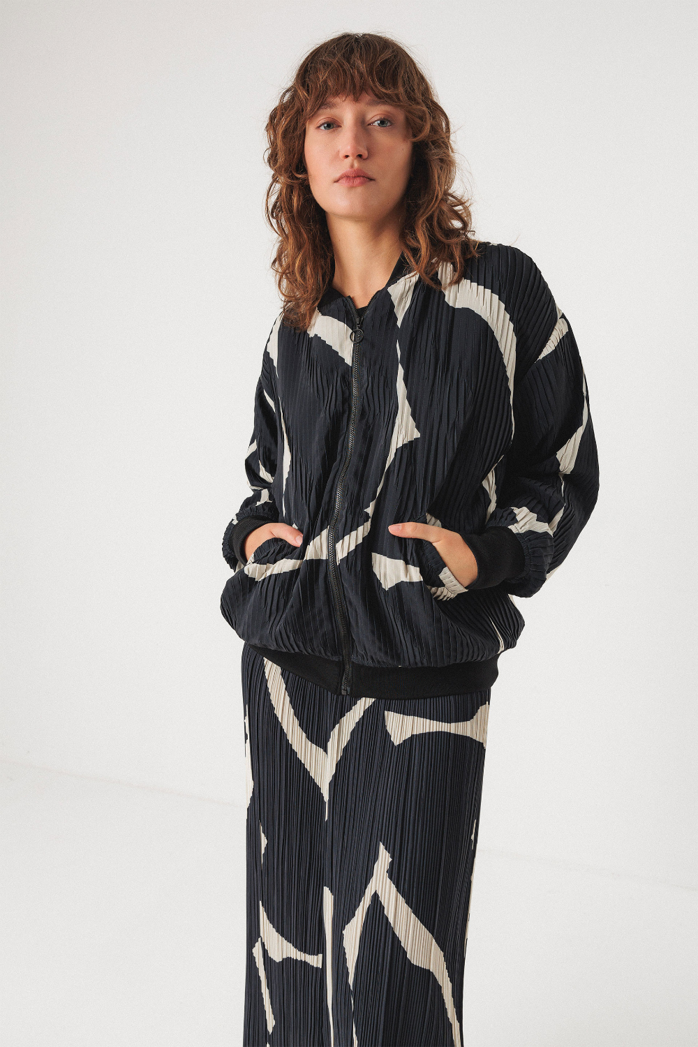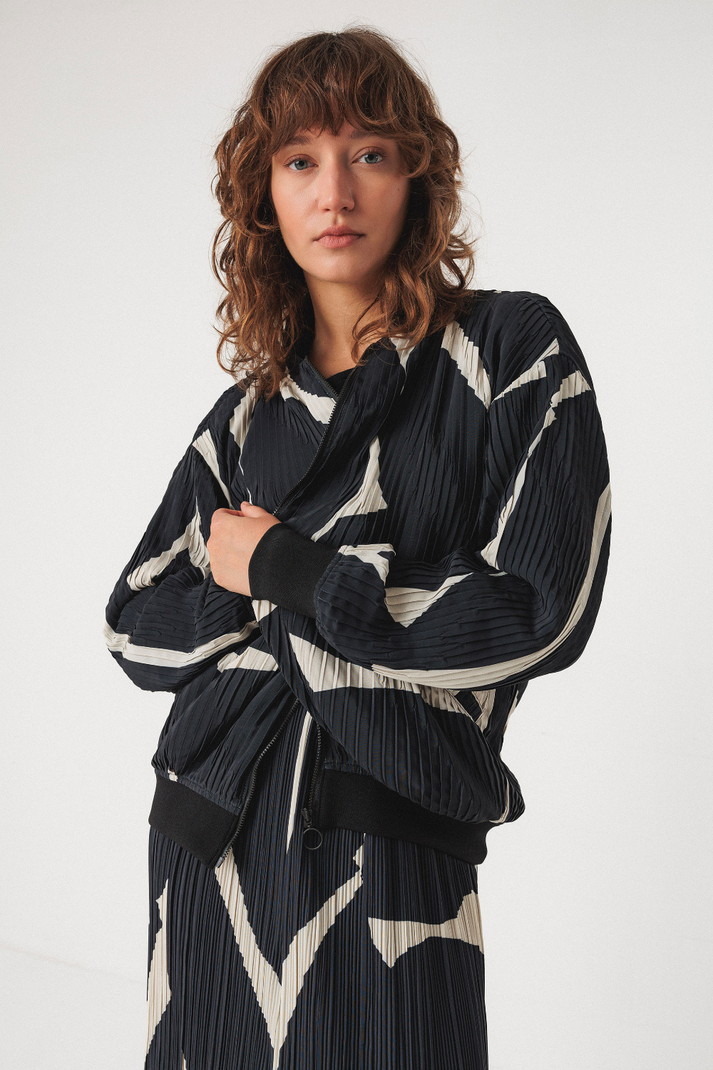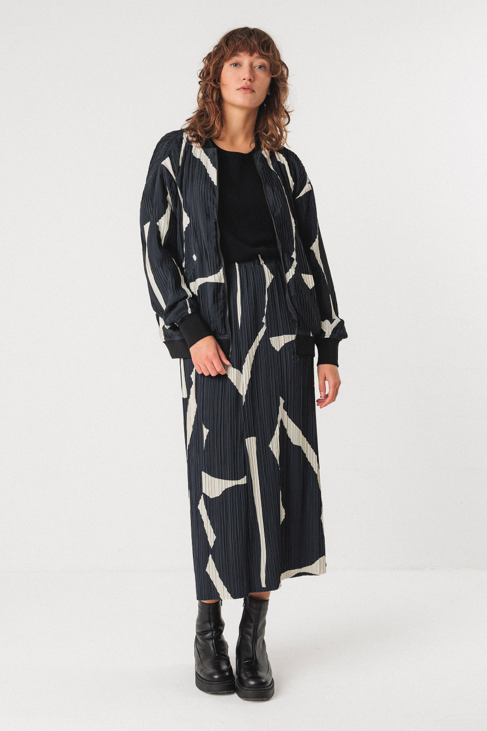 Cazadora bomber oversize de efecto plisado. Este modelo es reversible y tiene los hombros caídos y el cierre delantero de cremallera. Combinado en la foto con el falda LAURANE.