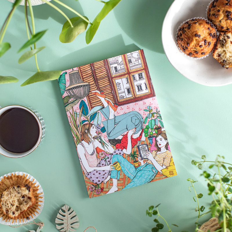 Cuaderno «Kiss Me Anytime» ilustrado por Ana Jarén. Formato 16 x 23 cm. 112 páginas (blancas/lisas). Papel natural de 120 g a prueba de rotuladores. Encuadernación cosida con lomo. Cubiertas plastificadas mate antiarañazos. Retractilado unitario.