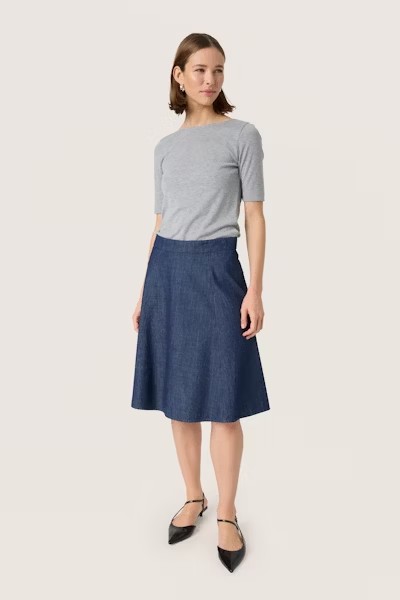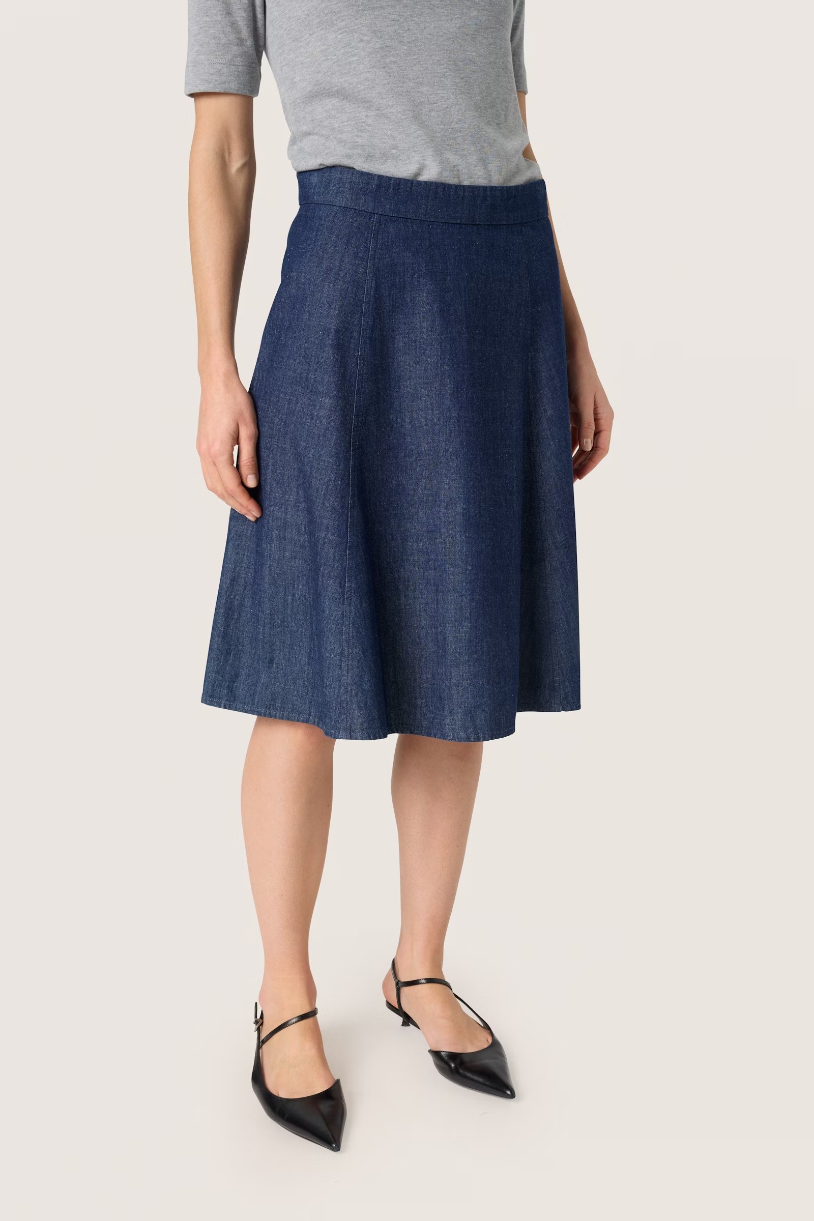 Falda vaquera clásica de la firma SOAKED de corte evasé en un azul atemporal. Diseñada con un ligero vuelo para una silueta favorecedora y un estilo desenfadado. Cuenta con cierre de cremallera en la espalda y está confeccionada en tejido suave.