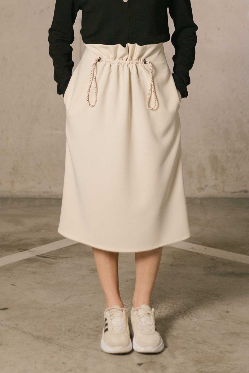 Falda de la firma PAN Producto Básico, de corte recto con ajuste de cuerda en la cintura. En color crudo.