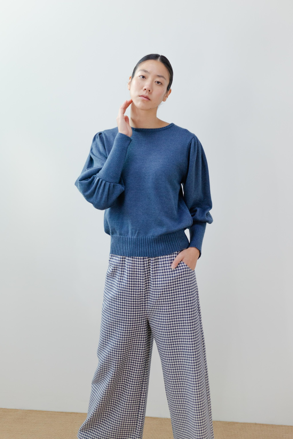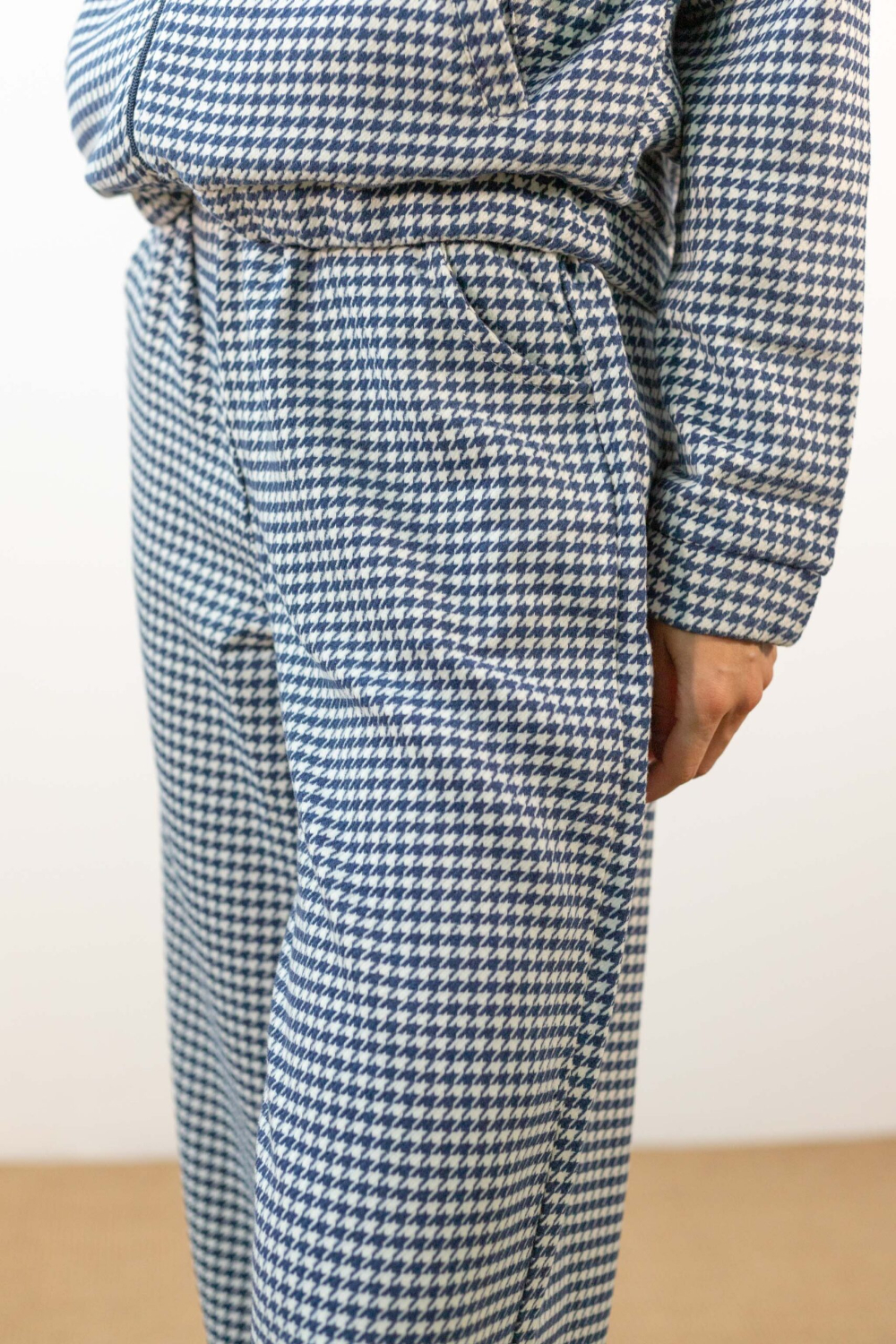 Pantalón de la firma PAN Producto Básico 100% algodón de estampado pata de gallo en azul. El apresto lo hace un pantalón gustoso al tacto y cómodo de llevar, con elástico en la cintura y bolsillo laterales. Perfecto para crear el total look con la bomber pata de gallo.