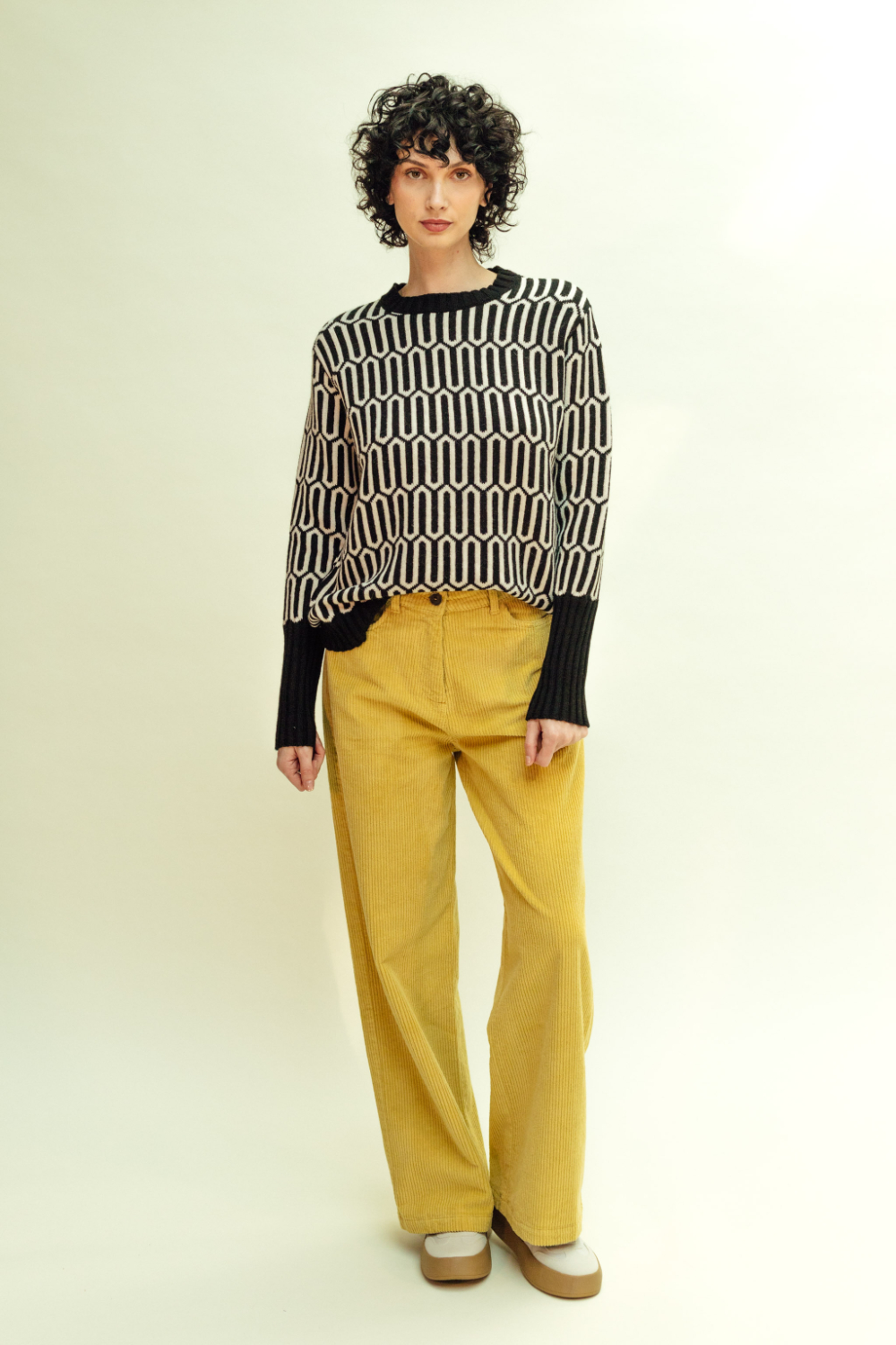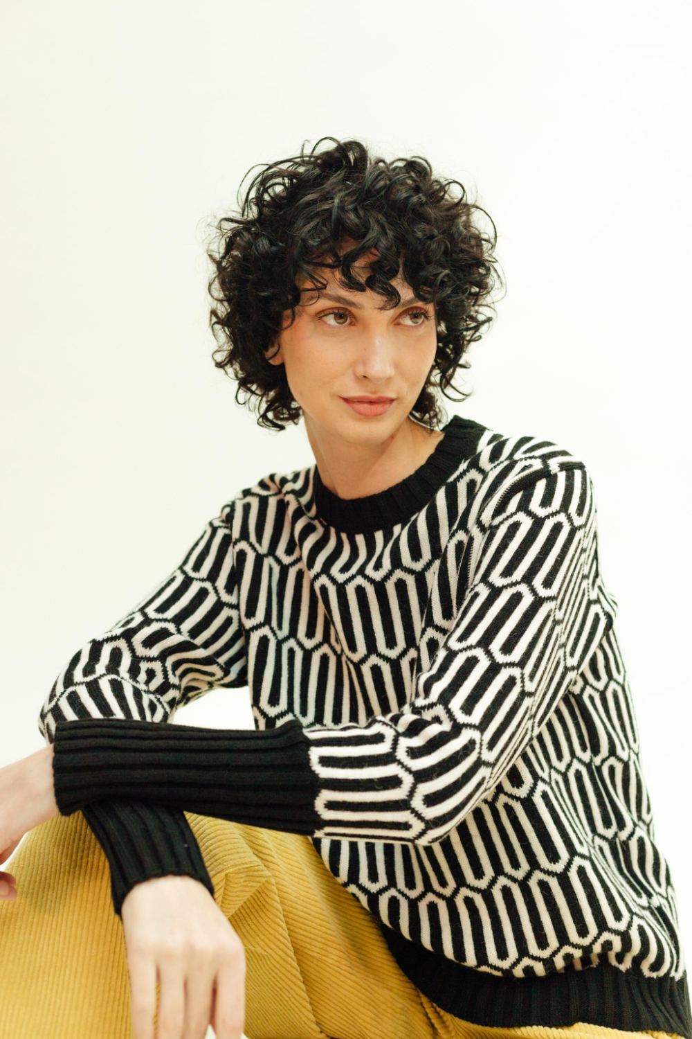 Jersey de punto con estampado geométrico en blanco y negro. Cuello redondo y remates en canalé negro que aportan contraste y estructura. Manga larga con puños acanalados extra anchos para un ajuste cómodo y un toque moderno.