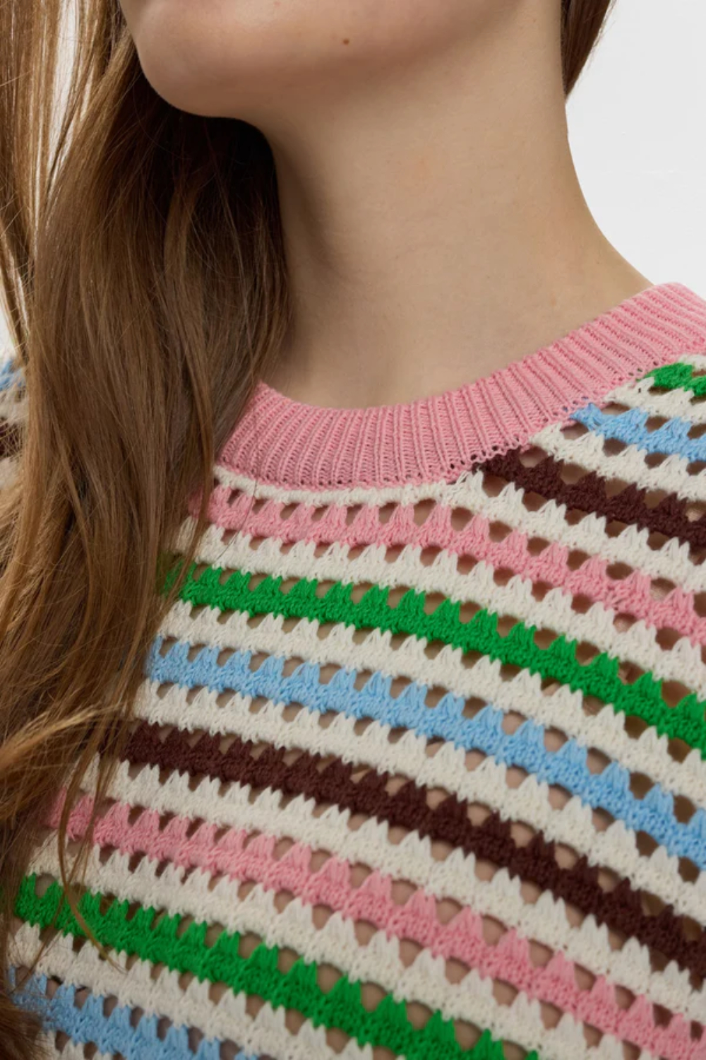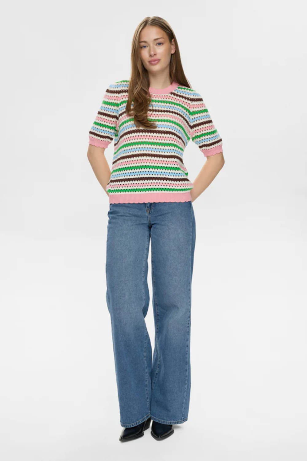 Jersey de la firma danesa NUMPH con un alegre estampado a rayas multicolores. El diseño presenta un corte relajado con mangas cortas y un cuello redondo acanalado. Las rayas en tonos pastel como rosa, azul, verde y marrón se combinan con un patrón de puntos, añadiendo un toque retro y divertido. El borde inferior y las mangas están rematados con un ribete de crochet, lo que aporta un acabado delicado y juvenil.