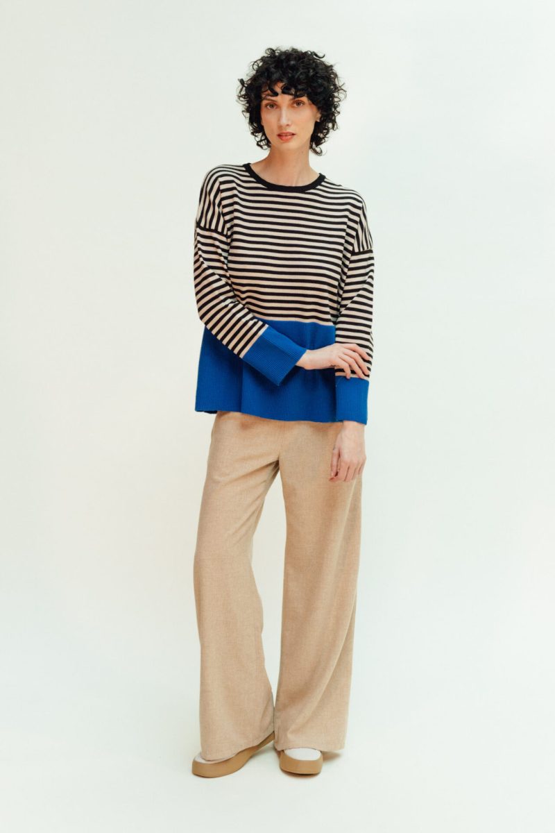Jersey de punto con cuello redondo, manga larga, corte recto y banda de color azul en la parte inferior del cuerpo y los puños.