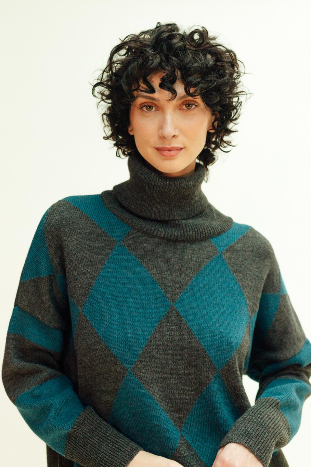 Jersey de punto con estampado de rombos en tonos gris carbón y azul petróleo. Cuello alto de estilo chimenea que aporta calidez y un acabado elegante. Manga larga con puños acanalados para un ajuste cómodo.