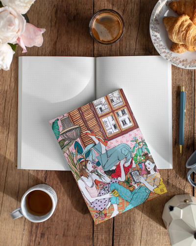 Un cuaderno forrado en lino e impreso con detalles metálicos brillantes. Incluye tres bullet journals extraíbles. Impreso en papel sostenible con cuadrícula de puntos. Un cuaderno para hacer lluvias de ideas, dibujar o lo que quieras. En la parte trasera, encontrarás un práctico bolsillo para guardar todas las cosas pequeñas y notas sueltas.