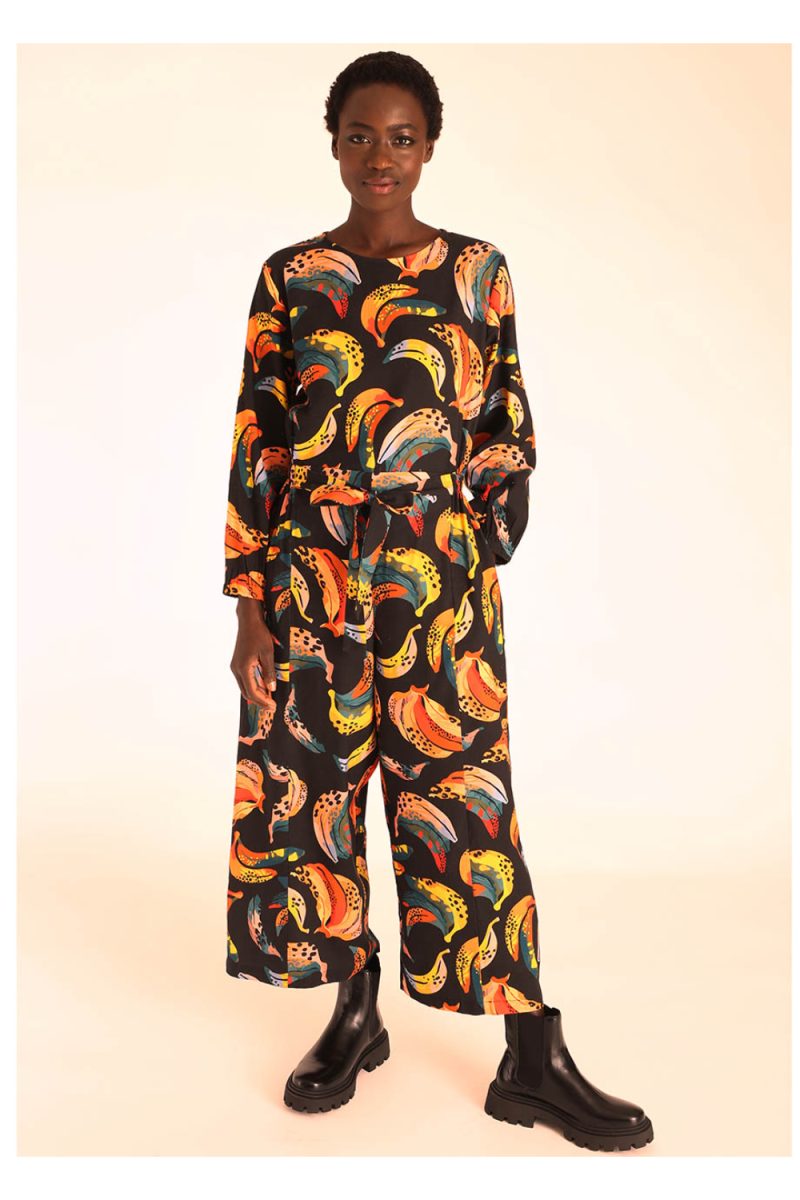Mono de la firma PEPALOVES con cuello barco y manga larga. Con elástico y lazo para mejor ajuste a tu figura. Con estampado pop de plátanos multicolor.