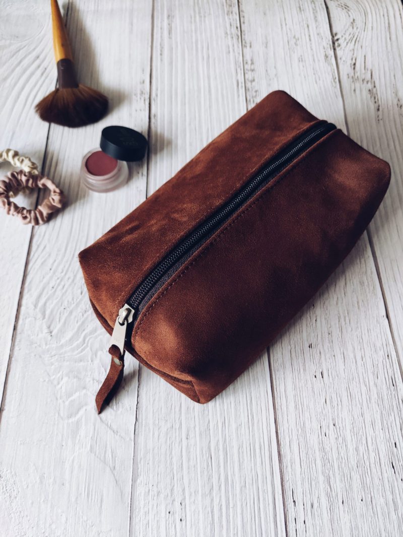 Neceser de serraje en color marrón, tacto suave afelpado. Puedes usarlo tanto de neceser como de estuche. Hecho de manera artesanal en España.
