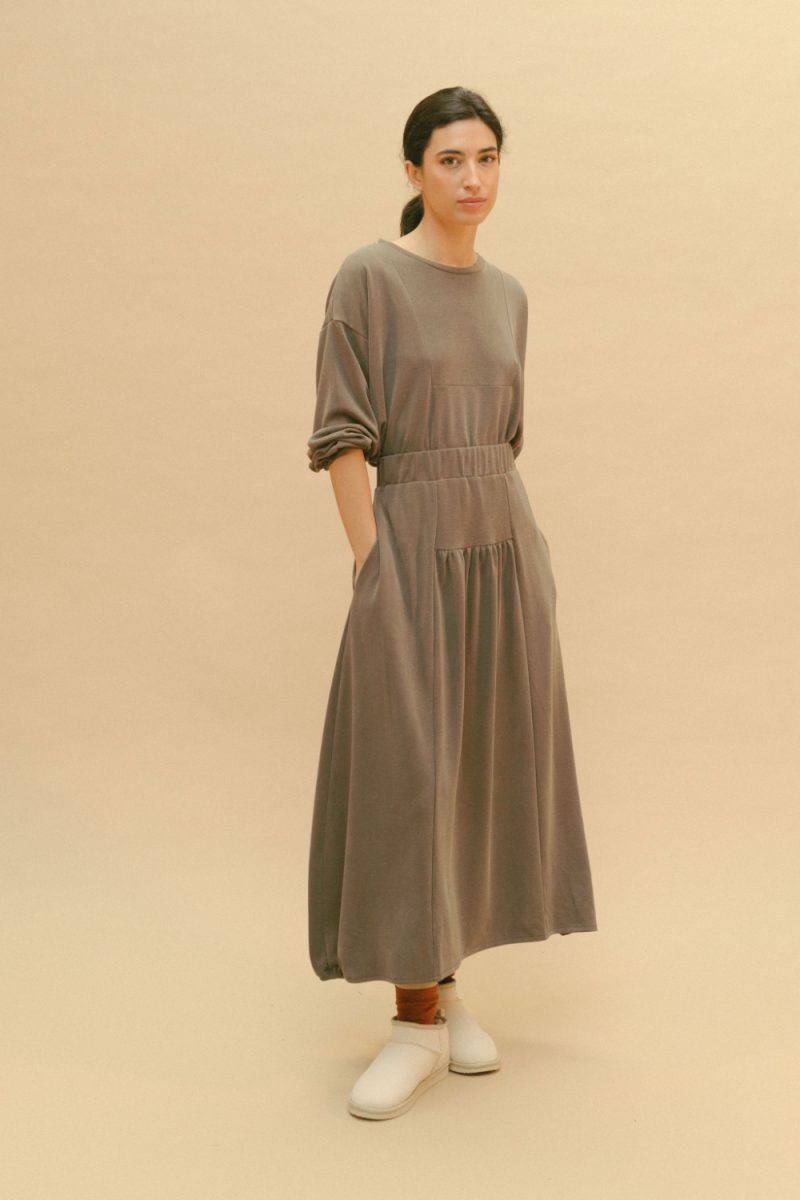 Blusa/top de corte amplio en color gris topo, con detalle de fino puño elástico y confeccionada con tejido cómodo y suave al tacto, perfecta para combinar con la falda Taupe de la misma colección.