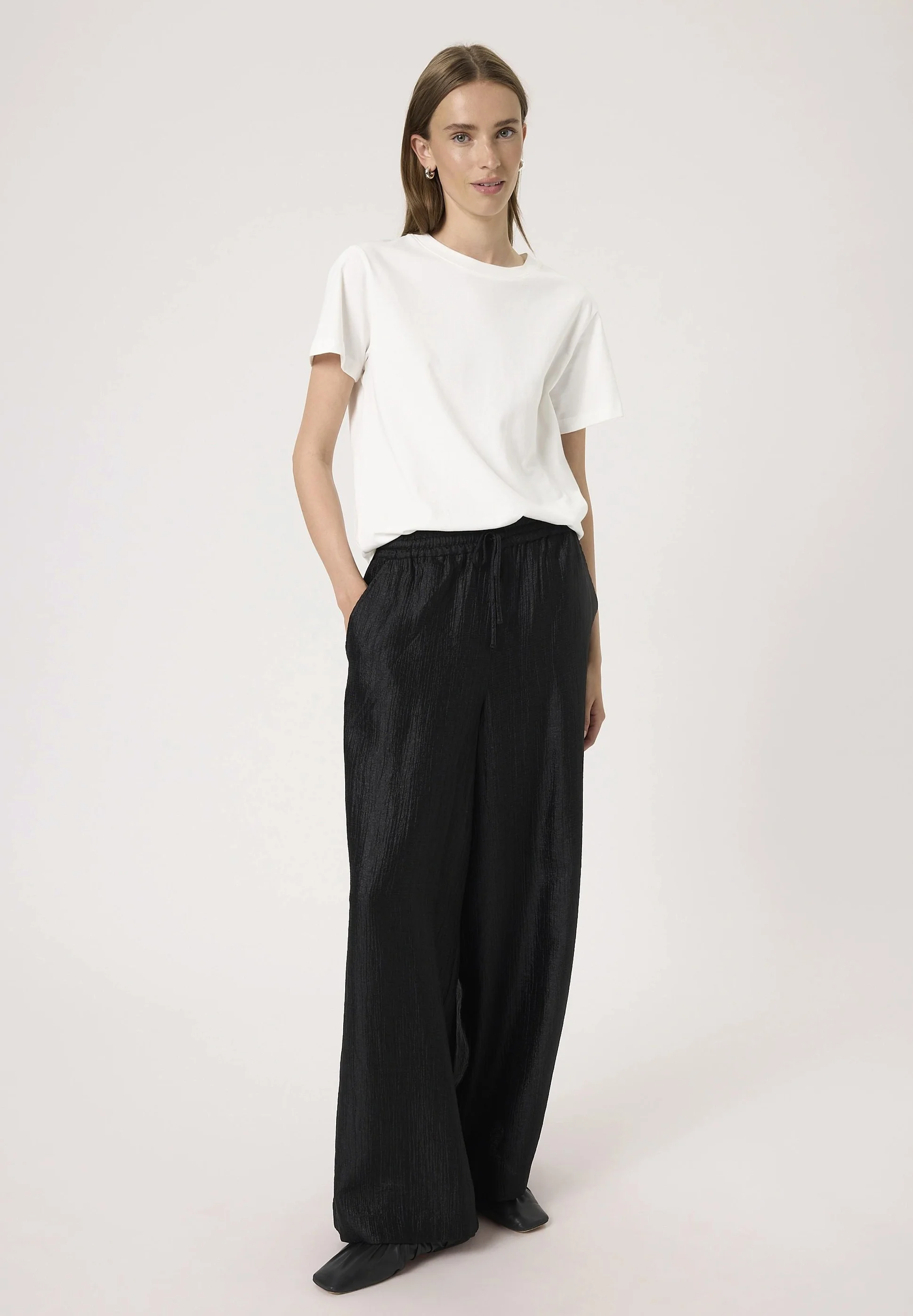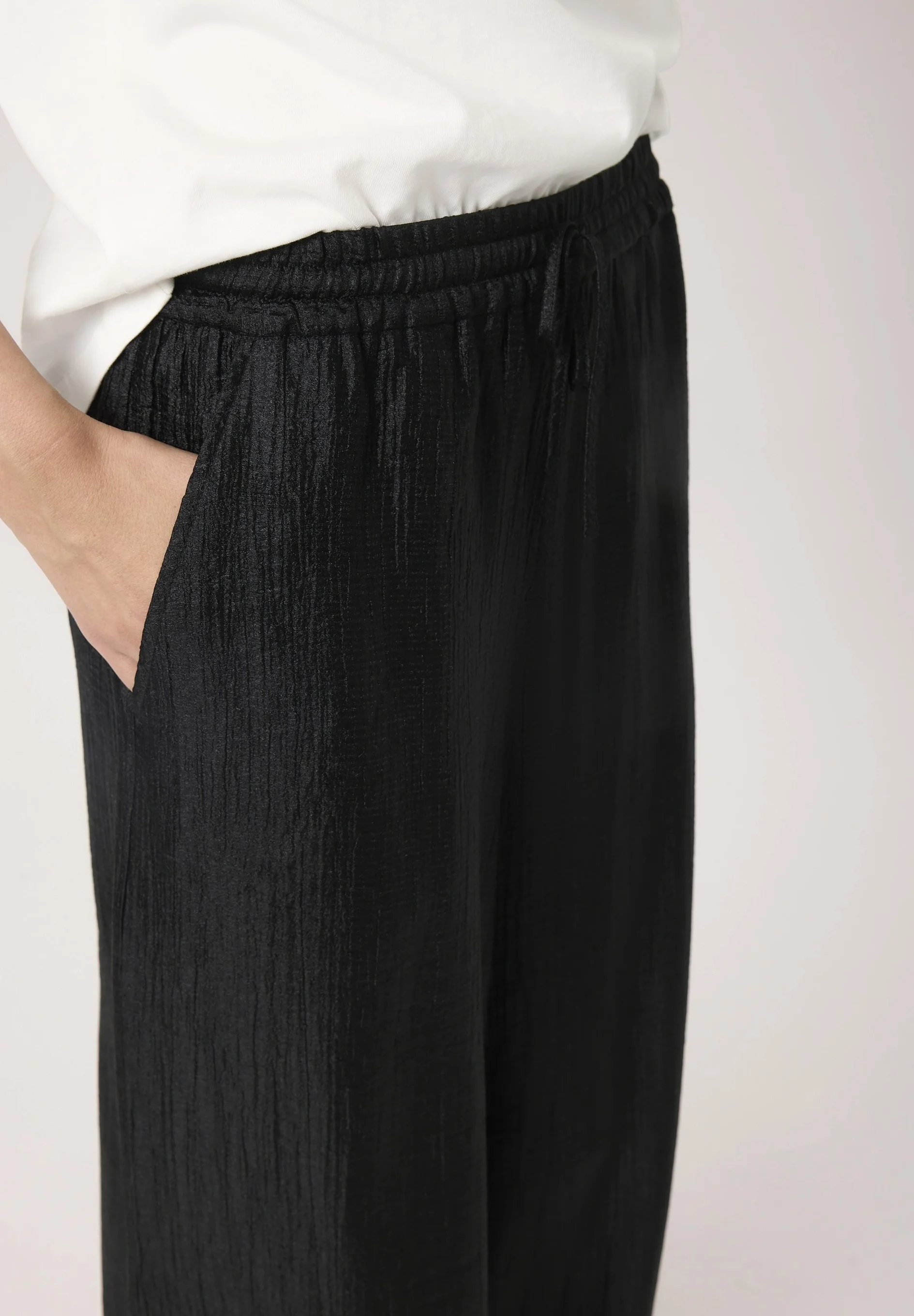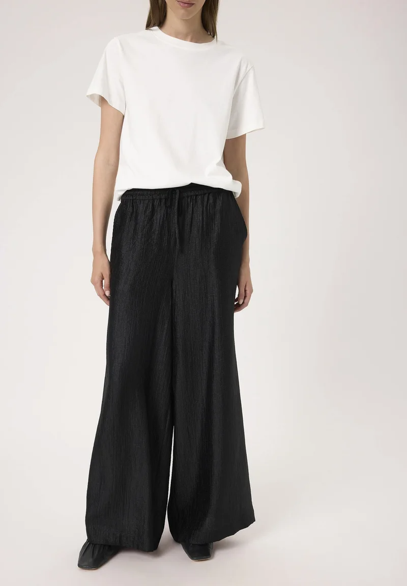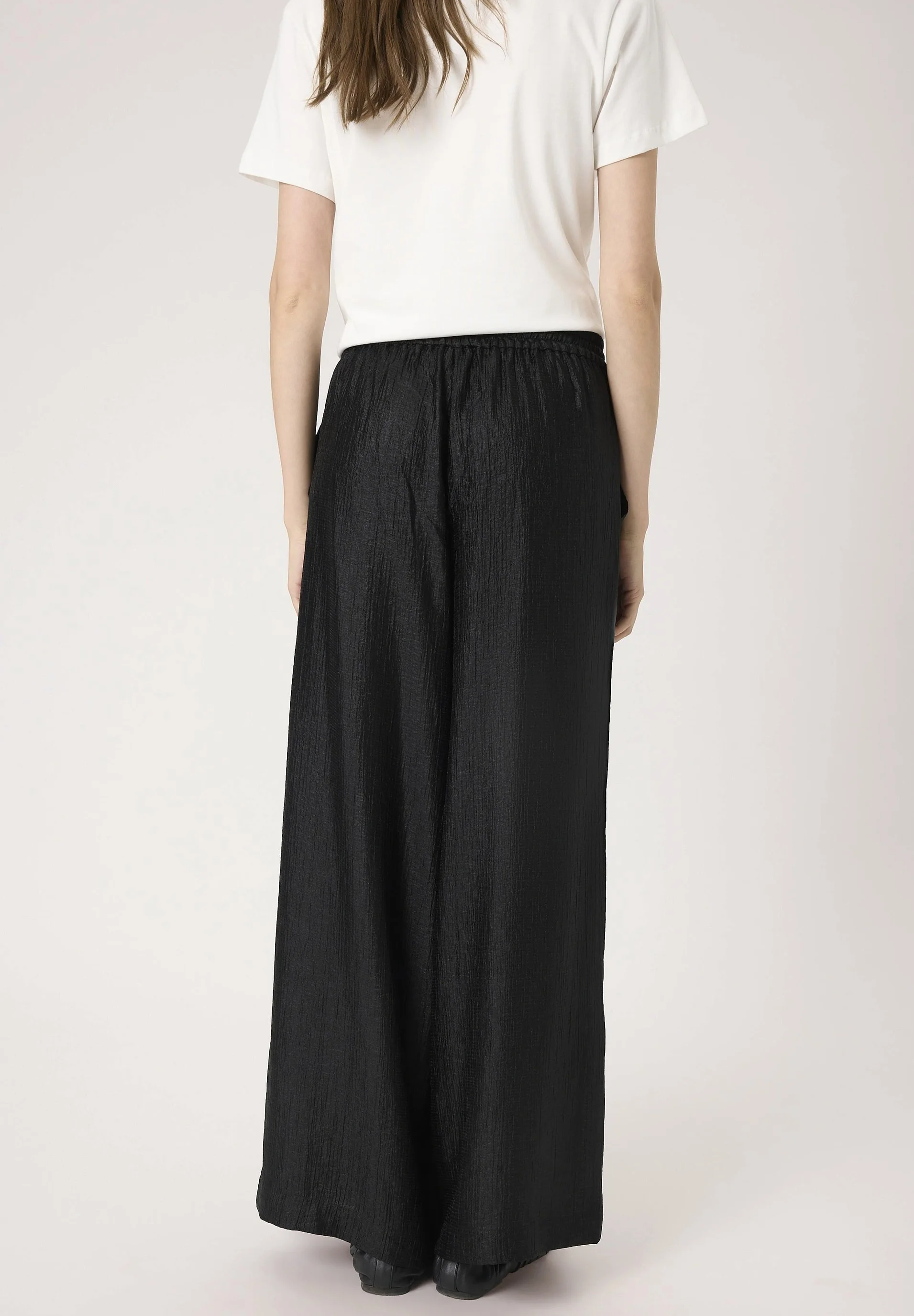 Pantalón amplio de la firma danesa SOAKED con un diseño elegante y fluido. Confeccionado en un tejido ligero de acabado satinado y textura sutilmente arrugada, ofrece un movimiento natural y un estilo sofisticado. Presenta cintura elástica con cordón ajustable para mayor comodidad y versatilidad.