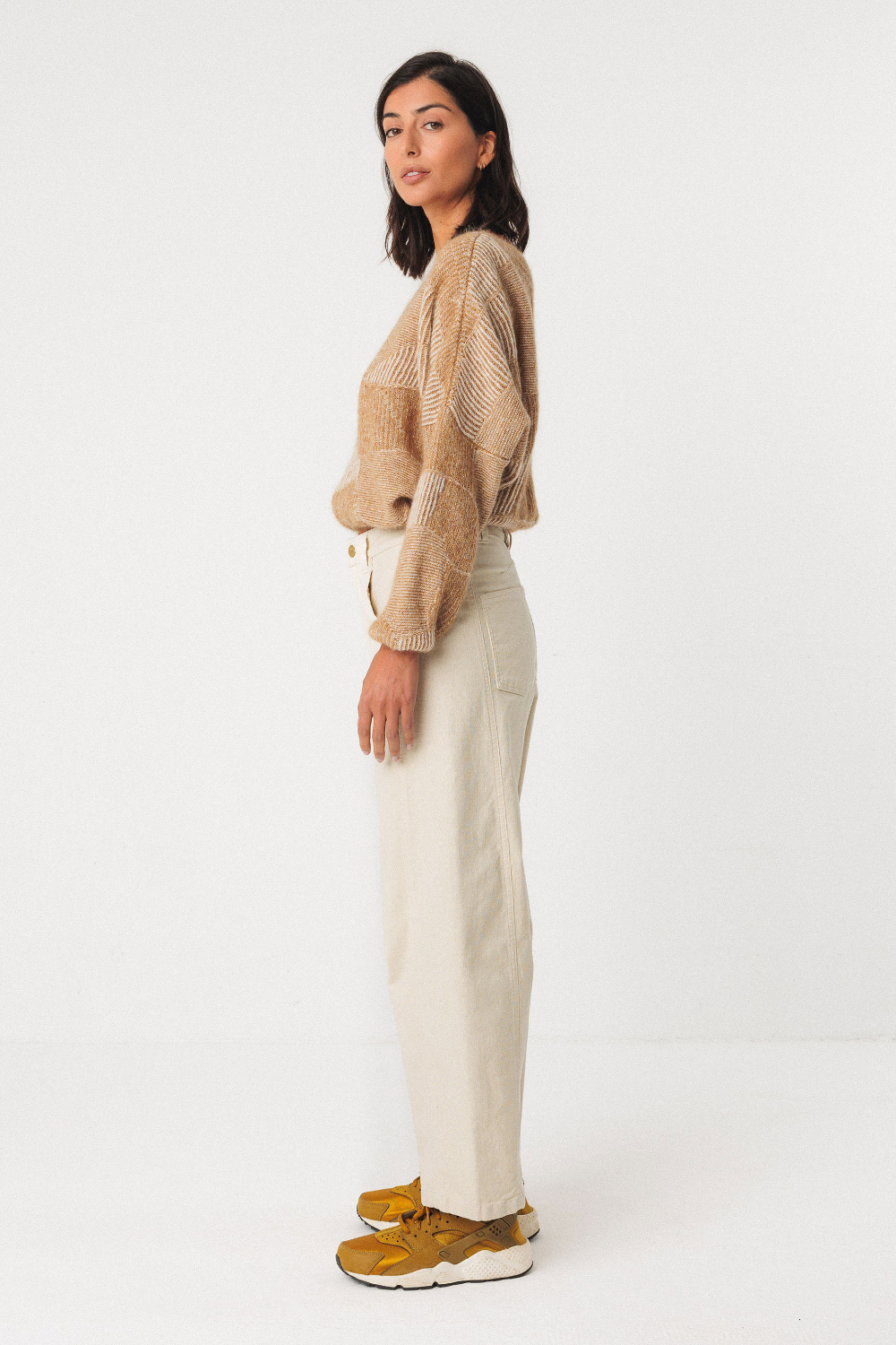 Pantalón amplio de terciopelo fino de algodón orgánico con certificado GOTS. De corte hasta el tobillo, se cierra con una bragueta con cremallera delantera.