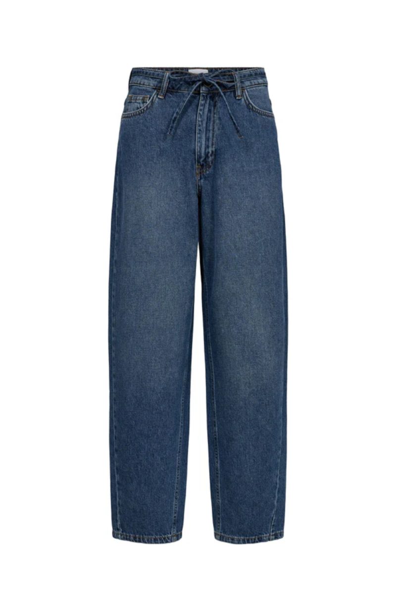 Pantalón de la firma danesa Nümph de tejido vaquero, recto de cintura alta con bolsillos laterales y traseros, y en color azul oscuro. Con cinturón vaquero