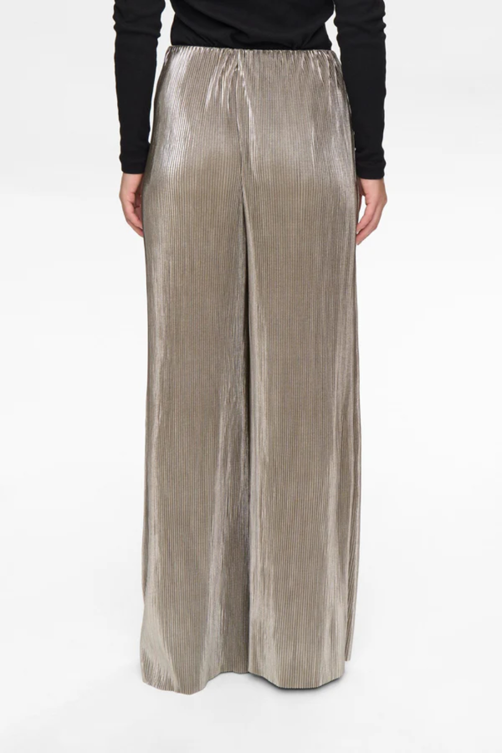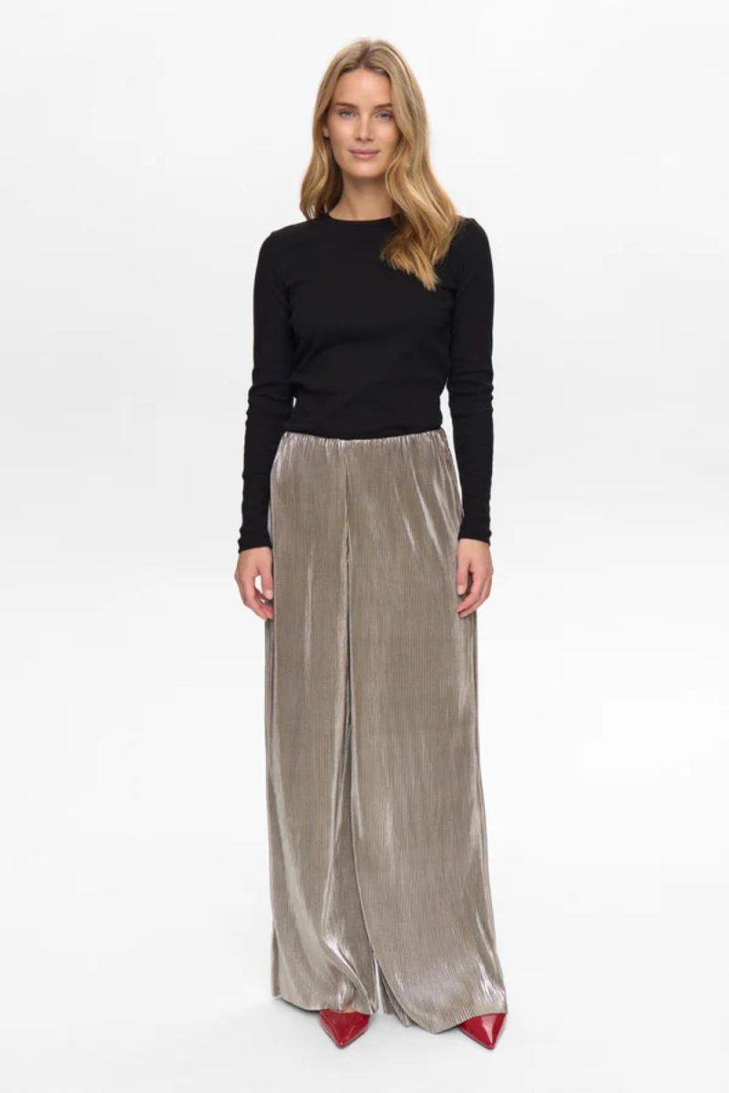 Pantalón de la firma danesa NUMPH en color plateado con textura acanalada y acabado brillante tipo terciopelo. Presenta cintura elástica y pernera ancha de corte fluido que aporta movimiento y elegancia.