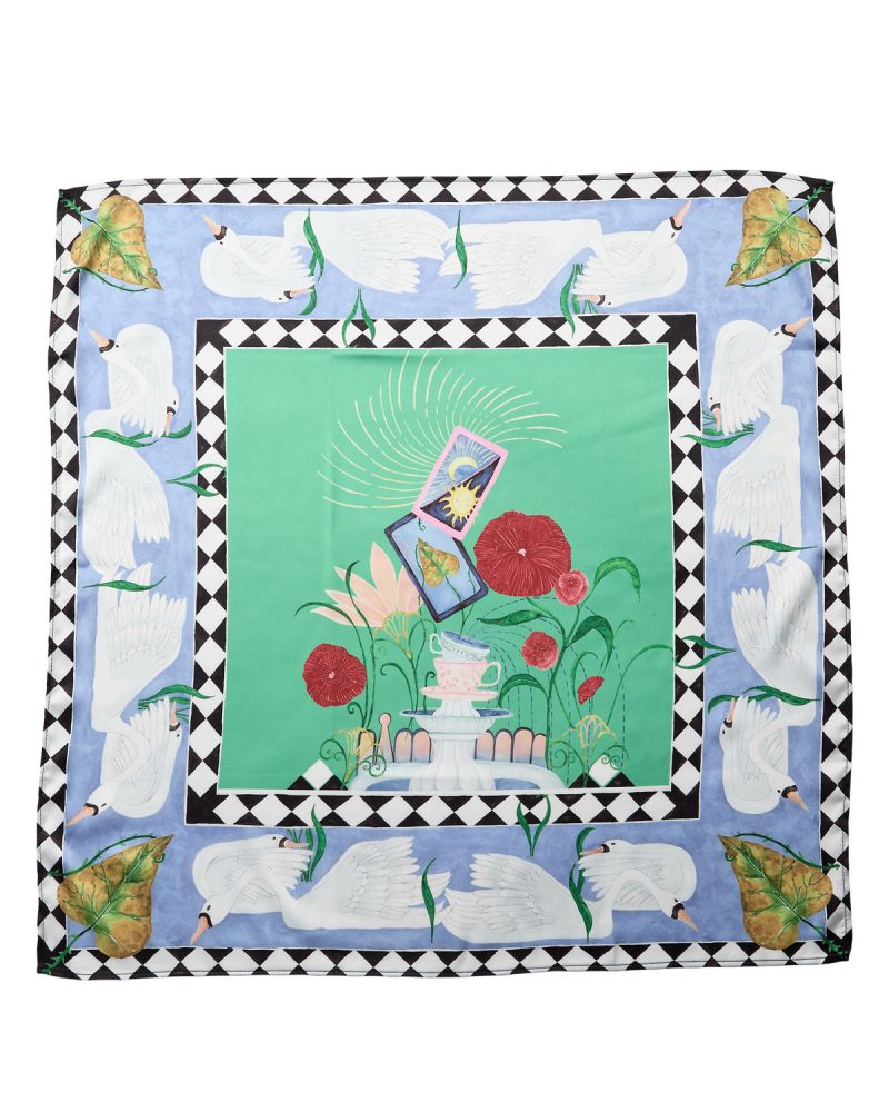 Pañuelo de satén con estampado ilustrado, pensado como complemento para looks diarios o más cuidados. Presenta un diseño con variedad de colores reflejando la imagen de un cisne como detalle. Su formato cuadrado permite llevarlo al cuello, en el cabello o anudado al bolso de forma sencilla.