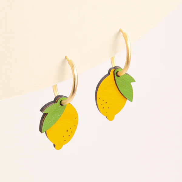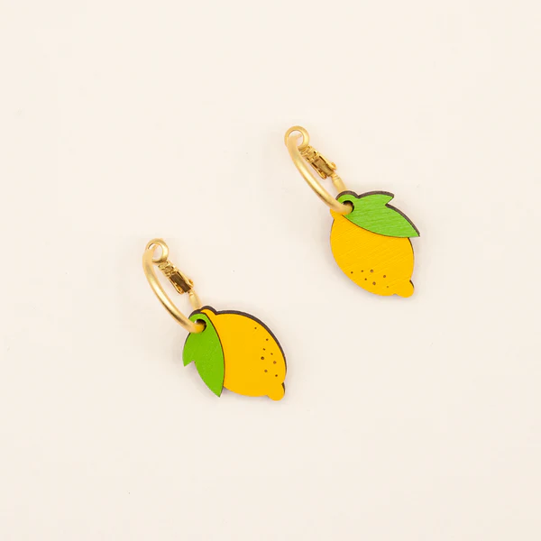 Pendientes de aro con dos limones y hojas para un look afrutado, ácido y atrevido. Cada dije está pintado en amarillo brillante y verde suave.