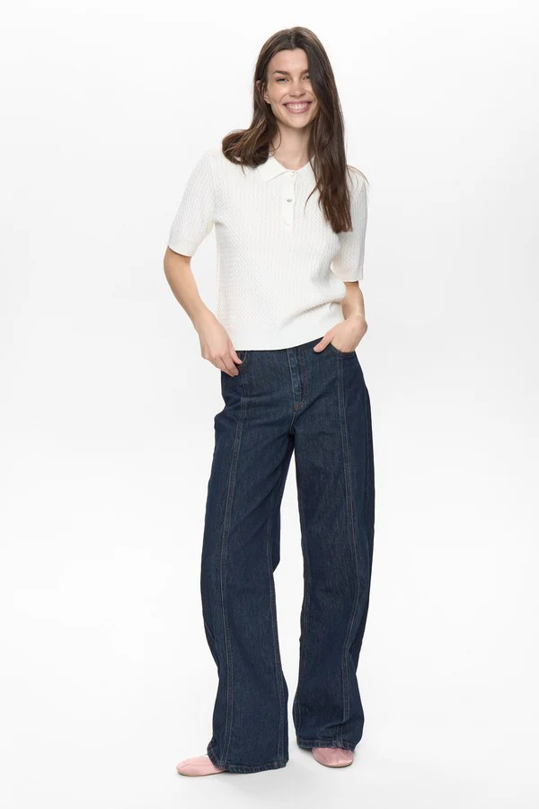 Polo de punto de diseño sencillo y elegante, ideal para un estilo casual con un toque sofisticado. Confeccionado en un tejido de punto fino y elástico, presenta un acabado acanalado en tono beige que aporta textura y confort. Su corte entallado, las mangas cortas y el cuello tipo polo con botonadura frontal realzan la silueta de forma favorecedora
