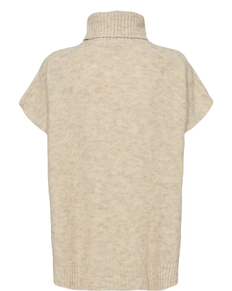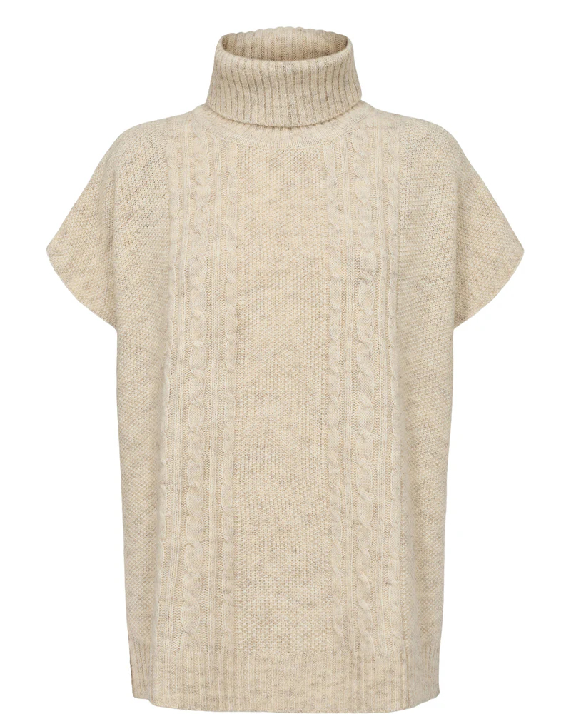 Poncho de punto de la firma danesa NUMPH en color crema con mangas cortas tipo casquillo, cuello alto y detalles de punto trenzado en la parte delantera y trasera