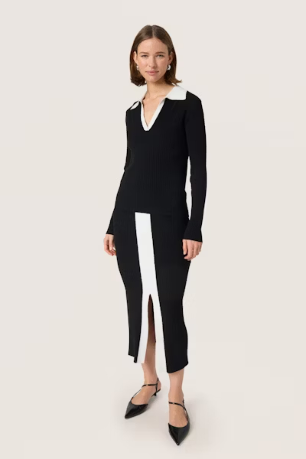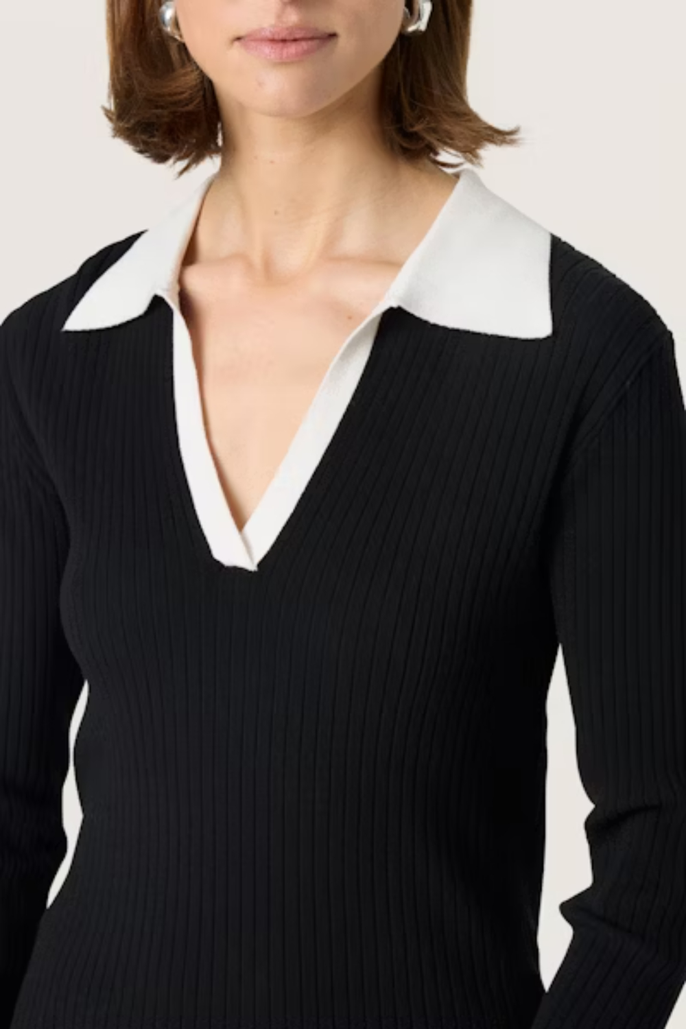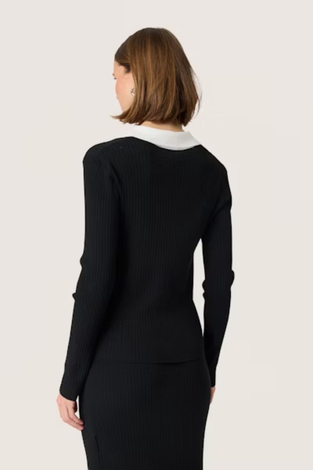 Top de punto de canalé negro de la firma SOAKED con escote en pico profundo y cuello blanco a contraste. Presenta un corte entallado y mangas largas para una apariencia refinada