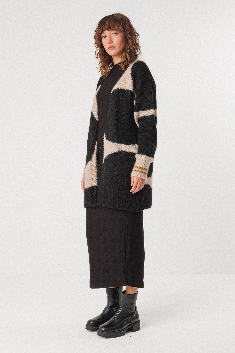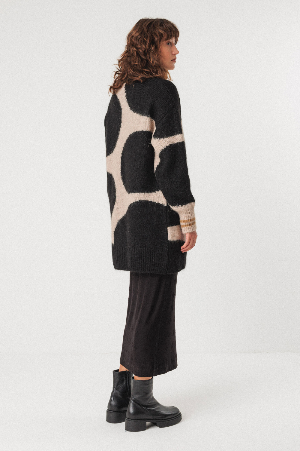 Cárdigan de alpaca reciclada mezclada hecho en Portugal. Es de punto semigrueso y se distingue por las mangas largas con efecto abombado.