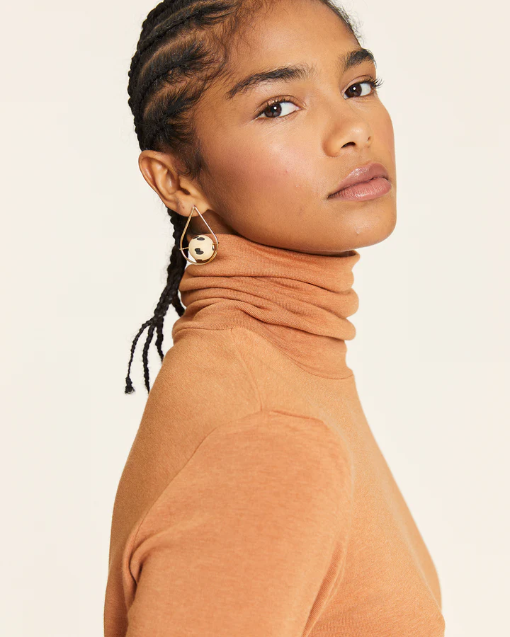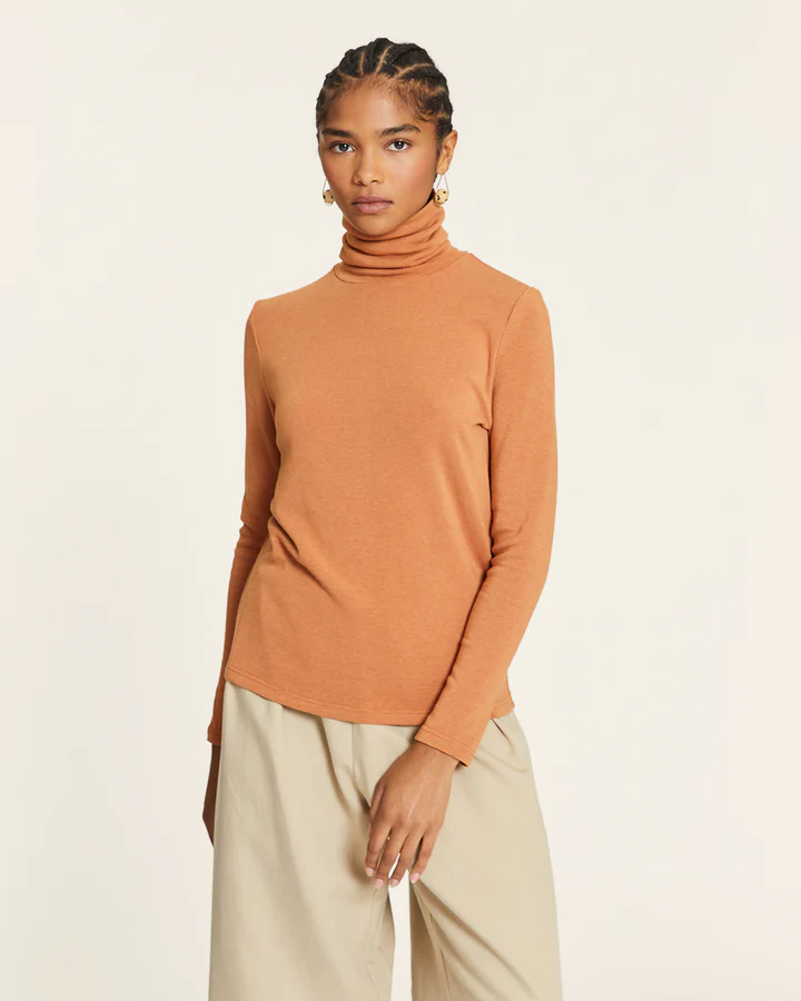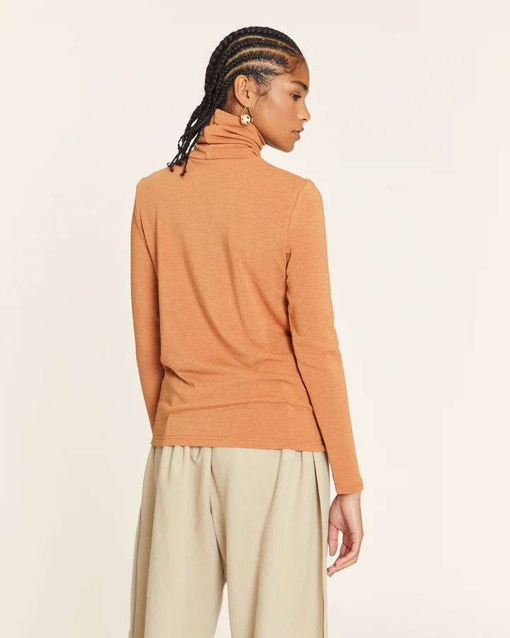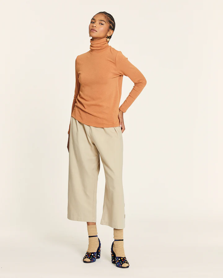 Top punto cuello cisne en color toffe, mangas largas rectas, a la altura de la cintura.