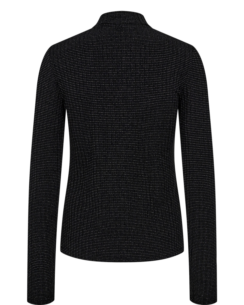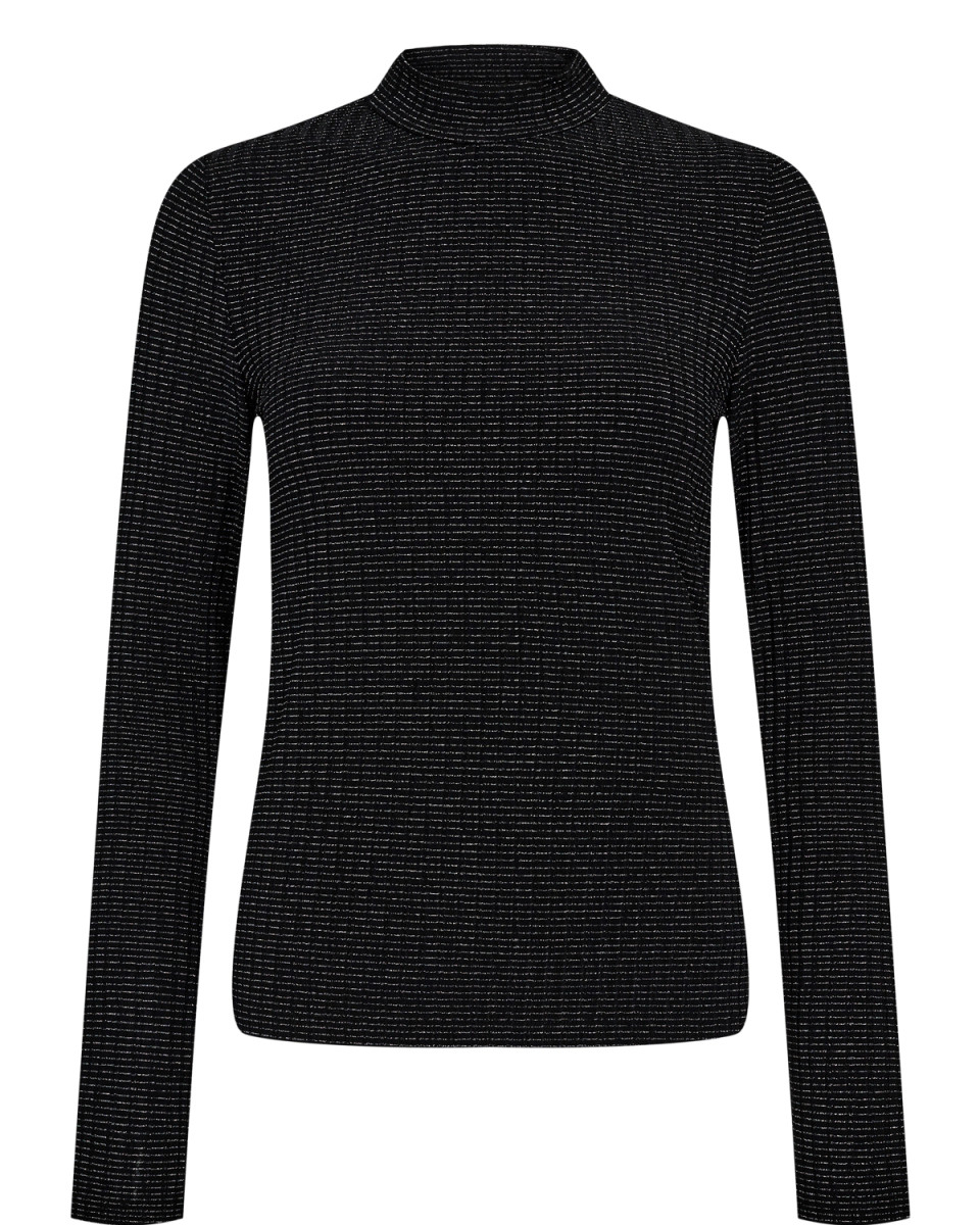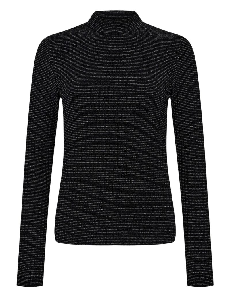 Blusa ajustada de la firma danesa NUMPH manga larga presenta un tejido de malla fina con sutiles hilos plateados, creando un efecto semitransparente que le aporta una elegancia discreta. Su cuello alto elástico ofrece un ajuste elegante y entallado que se adapta cómodamente al cuerpo, convirtiéndola en una prenda ideal para combinar con otras o en una opción destacada para un estilo sofisticado.