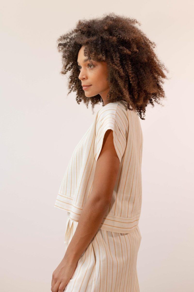 Top de manga corta de la firma española Pan Producto Básico en tejido beige con rayas amarillas. Ilustración original de PAN. Diseñado en España y made in Portugal.