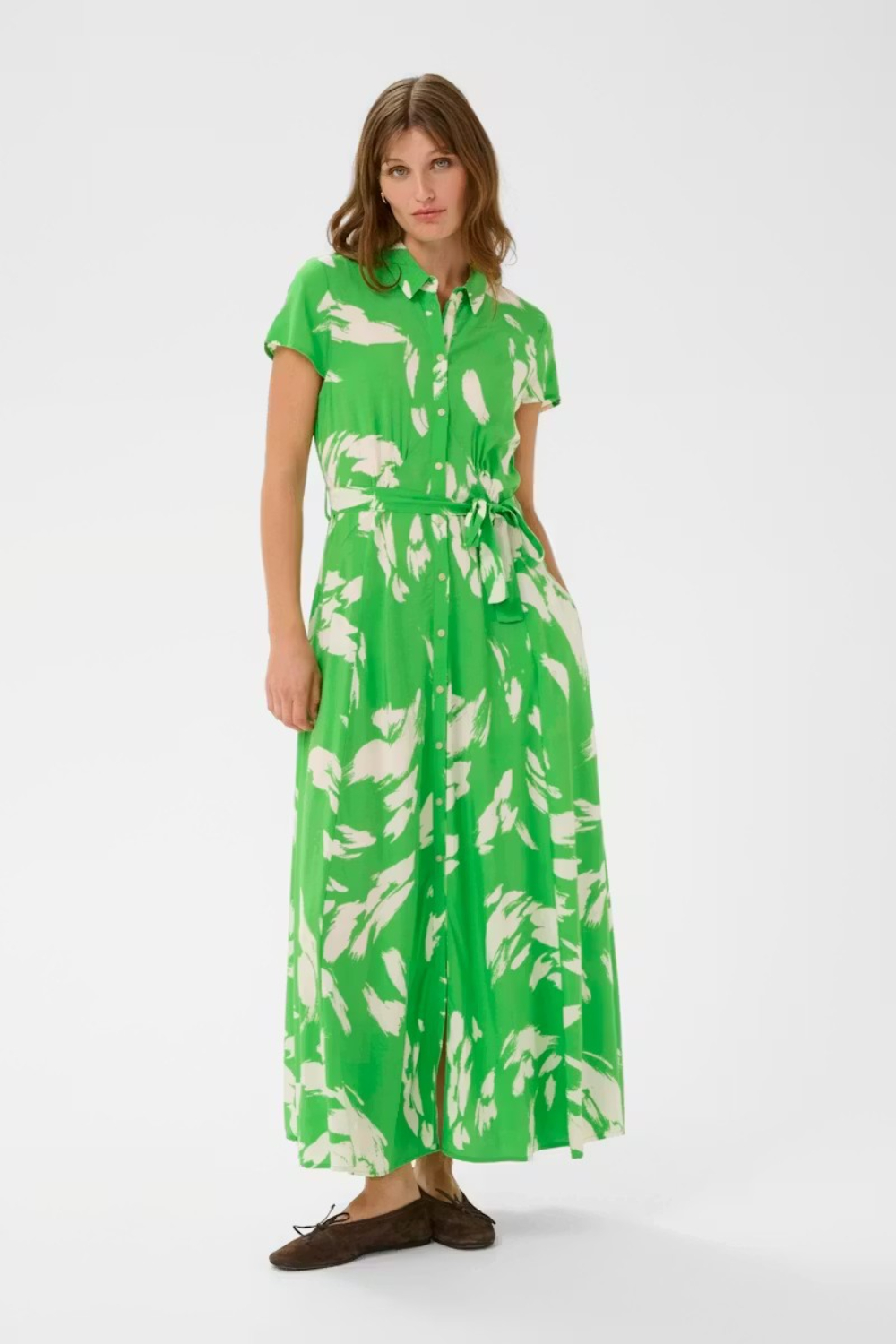 Este vestido camisero presenta un corte recto, cuello clásico, mangas cortas y una botonadura completa al frente. Un cinturón a juego define la cintura, mientras que su largo maxi fluido crea una silueta relajada.