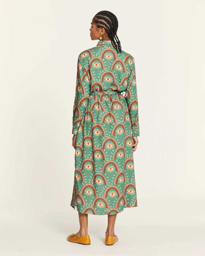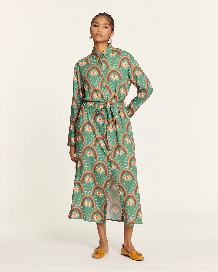Vestido camisero largo con abotonadura delantera. Mangas rectas con puños Banded. Lazo en la cintura.