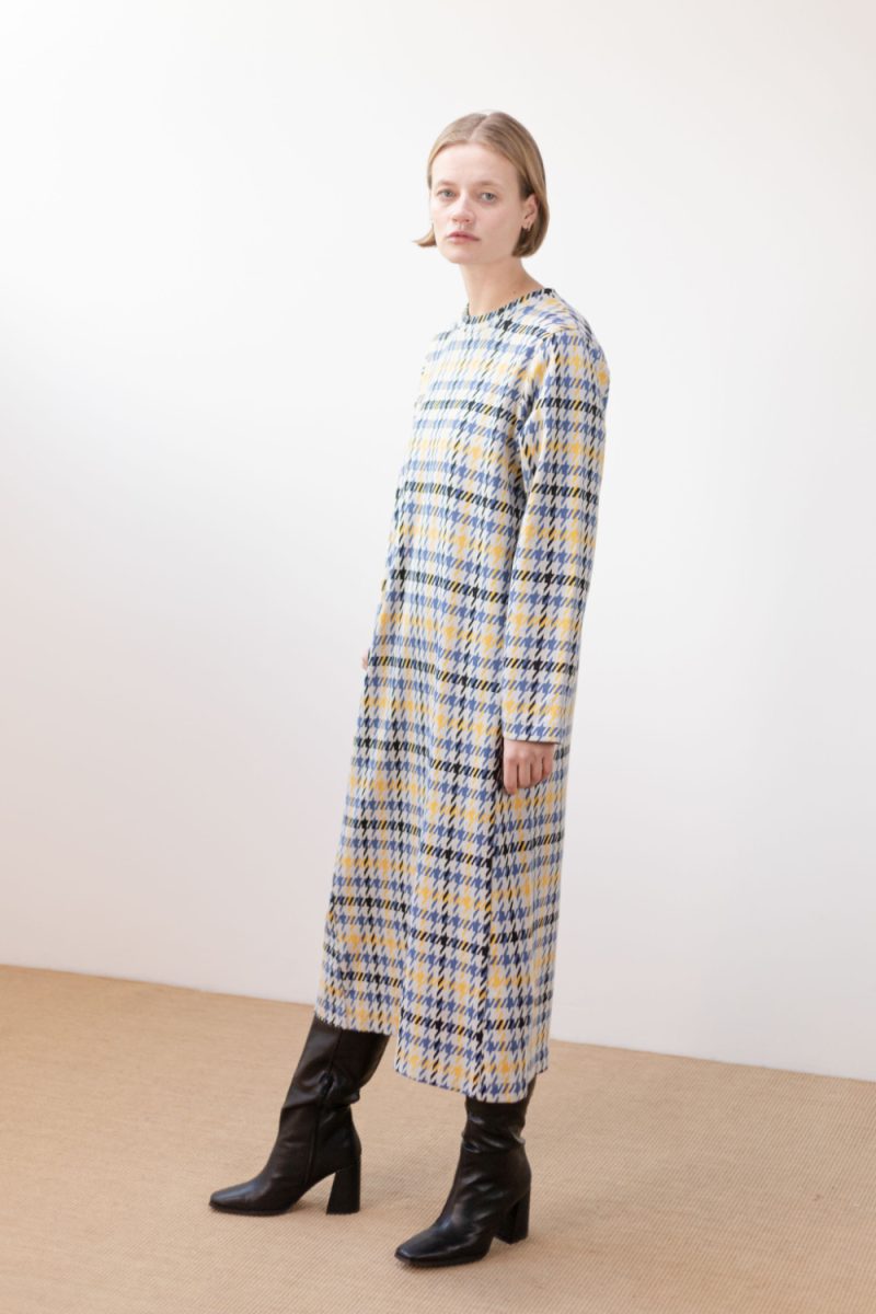 Vestido midi de la firma PAN Producto Básico de manga larga, corte amplio y cuello a la caja. Con estampado de pata de gallo en color azul, amarillo y negro sobre fondo gris.