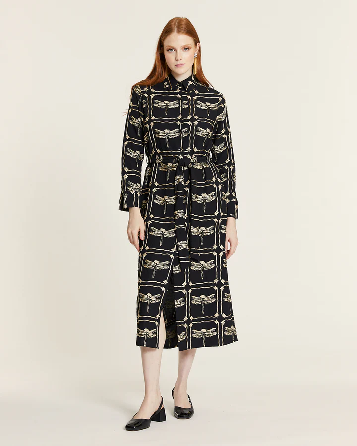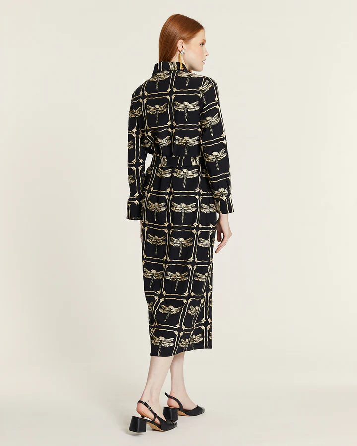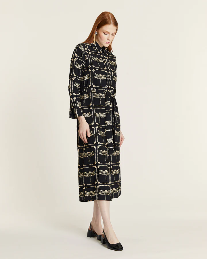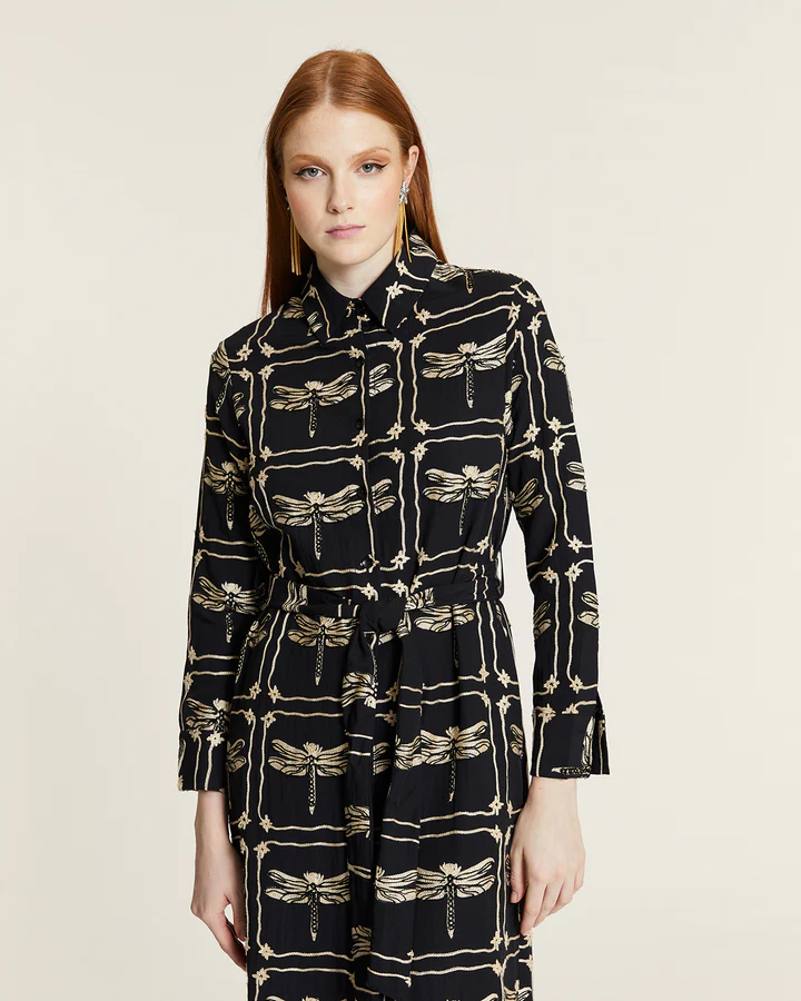 Vestido abotonado con bordado de libélulas, mangas largas rectas con puño abotonado y largo por debajo de la cadera.