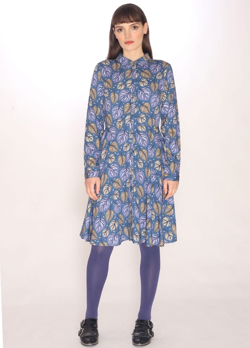 Vestido camisero corto de Pepal loves con estampado de hojas sobre fondo azul. Vestido fluido de corte suelto a la cintura, falda evasé, largo por encima de la rodilla y con detalle de bolsillos laterales.