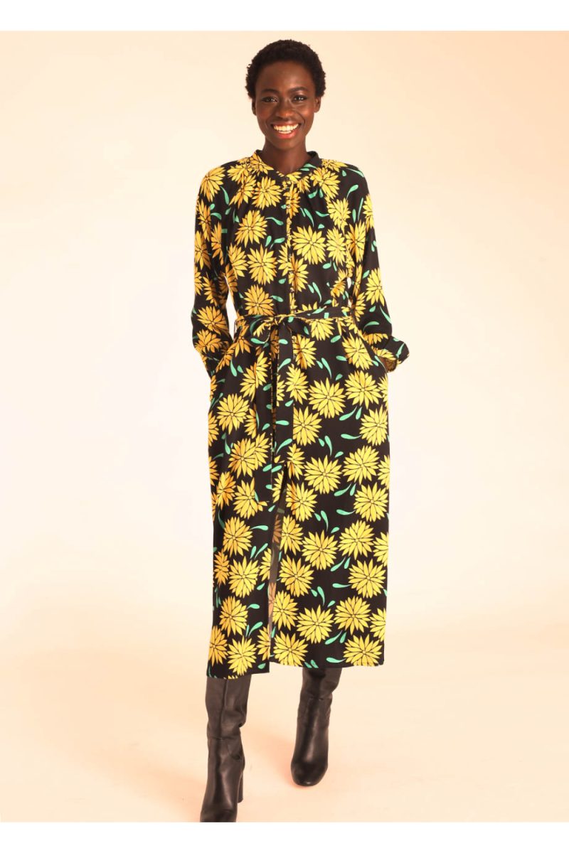 Vestido camisero de la firma PEPALOVES de corte midi y manga larga con estampado de dalias amarillas. Con cuello mao y lazo en la cintura para ajustar a medida.