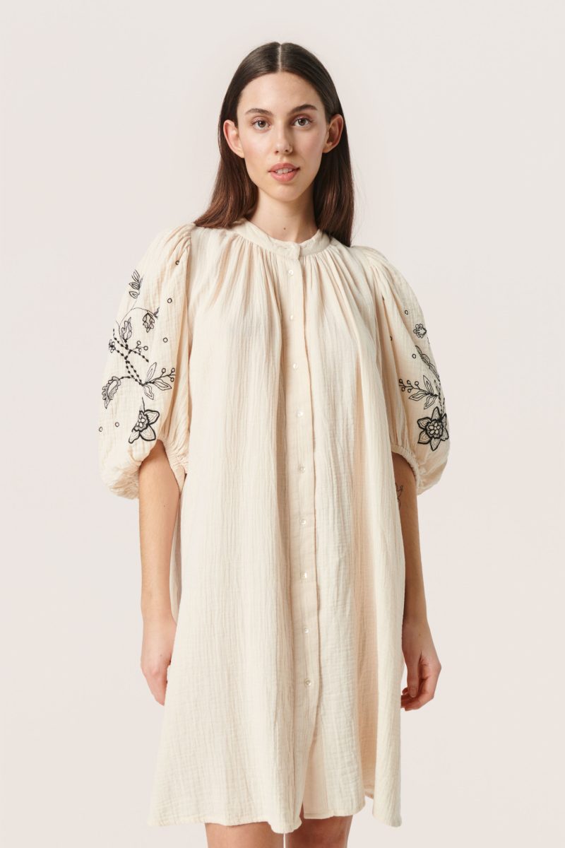 Vestido camisero midi de la firma SOAKED de corte muy amplio en color arena, con cuello mao y abotonado al frente, con mangas espectacularmente abullonadas con un precioso bordado de flores en color negro.